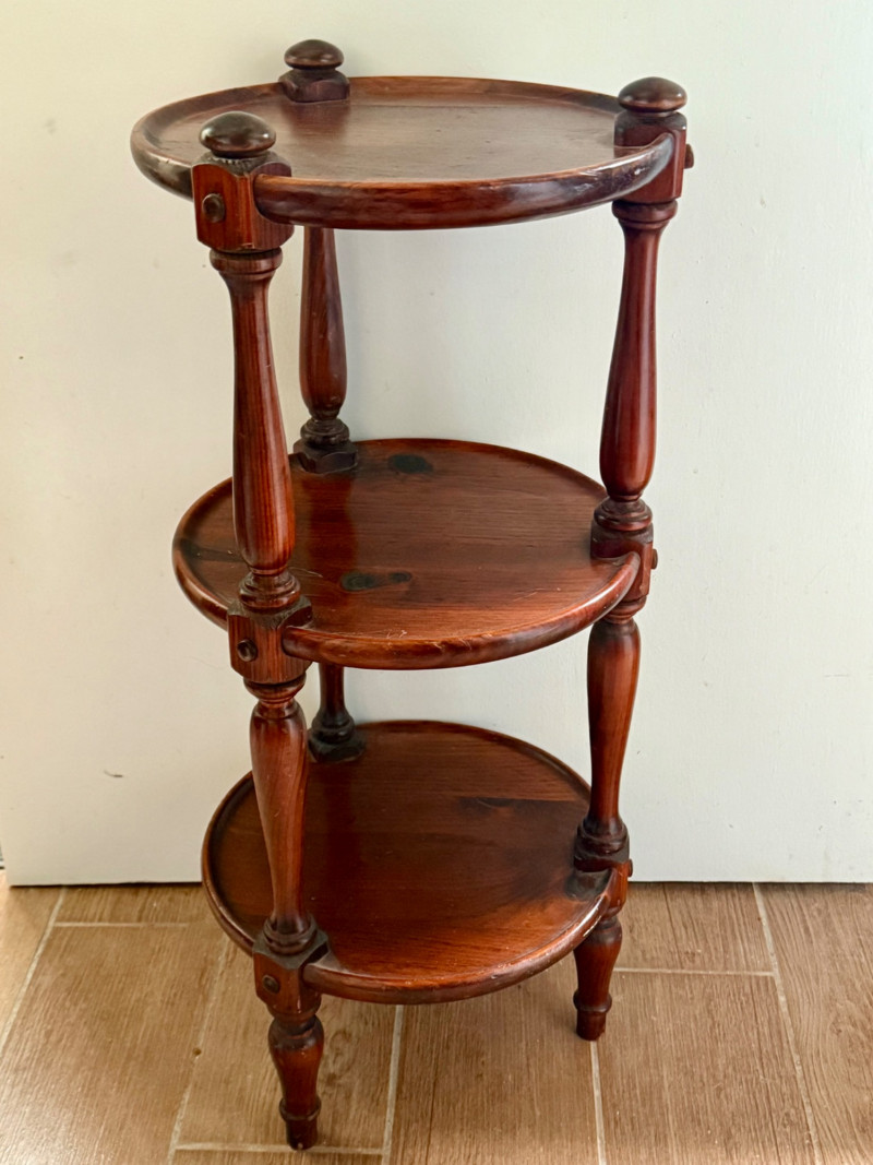 Ethan Allen Old Tavern Collection Pine 3-Tier Etagere Table – Circa 1970s A classic piece from the Ethan Allen Old Tavern Collection, this three-tier stand exemplifies early American craftsmanship with timeless elegance. Crafted from solid pine, it features beautifully turned legs and rounded shelves, ideal for displaying books, plants, or curios. Era: 1970s Material: Solid pine Dimensions: Approx. 27.5” H x 14” W (each shelf 11.5” diameter) Condition: Excellent vintage condition with minimal surface wear consistent with age. Structurally sound and rich in patina. A rare and desirable accent table that brings warmth and heritage to any space.