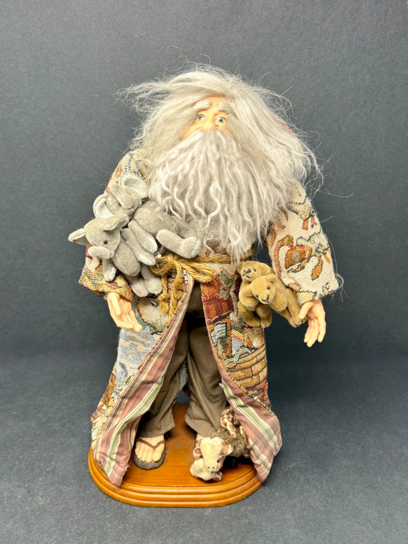 Vintage 1980s Boyds “Noah” Figurine – Two by Two Collection (#582) This whimsical and rare Boyds Bears “Noah” Figurine from the beloved Two by Two collection is a standout collectible from the 1980s. Handcrafted with meticulous detail, Noah wears a richly woven tapestry robe and carries an armful of plush animal pairs, symbolizing the biblical tale. This is a low-numbered edition (#582) from the original numbered handmade series. Details: Brand: Boyds Bears Series: Two by Two – Noah Figurine Handmade, numbered collectible (#582) Features plush animals: elephants, camels, mice, and giraffes Mounted on solid wood base Estimated size: approx. 15” H x 8” W x 6” D This piece is a beautiful example of Boyds' early craftsmanship and storytelling charm. A rare find for collectors of vintage Boyds Bears, art dolls, or biblical-inspired folk art.