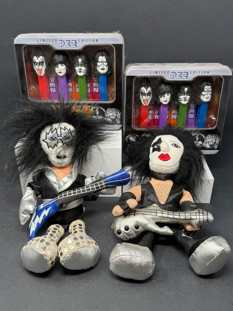 Limited Edition KISS PEZ Dispensers & Plush Dolls – Collectible Rock Memorabilia This exclusive collector’s set includes two limited edition KISS PEZ dispenser tins featuring vivid, detailed representations of each band member—Gene Simmons, Paul Stanley, Ace Frehley, and Peter Criss—complete with their iconic face paint. Accompanying the tins are two KISS plush dolls meticulously styled with signature costumes, guitars, metallic boots, and glam rock flair, capturing the band’s legendary stage presence. Maker: PEZ (dispensers), licensed KISS merchandise (plush dolls) PEZ Dispenser Tins: Approx. 7"W x 6"H Plush Dolls: Approx. 10"H each Why it’s special:
