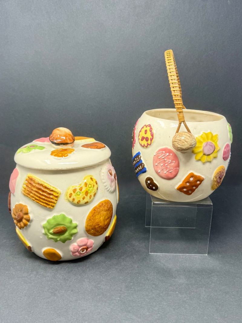1950s Holt Howard Cookie-Themed Ceramic Jar & Basket Set – Mid-Century Kitsch Kitchen Collectibles This delightful mid-century ceramic set by Holt Howard features a whimsical all-over cookie and biscuit motif, with vibrant hand-painted accents and dimensional charm. A true gem for lovers of 1950s novelty kitchenware. Details: Authentic Holt Howard, circa 1950s Includes: Lidded cookie jar with molded pastry shapes and nut knob Open ceramic basket with rattan handle and figural walnut detail Features an assortment of raised and painted vintage cookie and cracker designs Material: Glazed ceramic with applied details and woven handle Dimensions: Approx. 7"–10" tall (including handle) Condition: Excellent vintage condition with vivid color retention; no chips or cracks noted Why It’s Special: