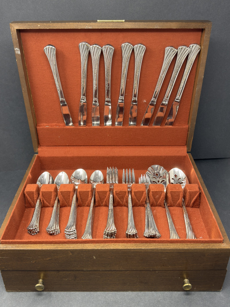 Vintage Oneida Silverplate Flatware Set in Box – Fan Tail Pattern (Mid-Century Service for 8+) This elegant Oneida silverplate flatware set features the timeless Fan Tail pattern, known for its flared, Art Deco–inspired lines and detailed floral scrollwork. Beautifully housed in its original felt-lined wooden case, this set is both display-worthy and dinner-ready. Flatware Count (from left to right): 9 dinner knives 13 teaspoons (little spoons) 8 tablespoons (big spoons) 7 dessert spoons 9 dinner forks (big forks) 9 salad forks (small forks) 9 cocktail/seafood forks (tiny forks) Additional Details: Brand: Oneida Pattern: Fan Tail (a.k.a. Broadlawn, circa 1950s) Material: Silverplate Case: Original 2-tier wooden box with brass knobs and rust-red felt lining Condition: Excellent vintage condition with light surface wear typical of age; all pieces present beautifully and are recently polished Also includes some misc silverware in bottom drawer Why It’s Special: