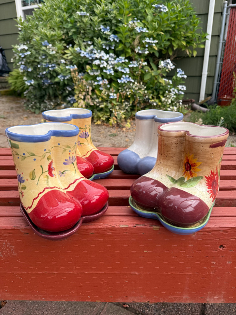 Set of 4 Fitz and Floyd Ceramic Rain Boot Planters – Hand-Painted – 1990s Garden Decor This whimsical set of four ceramic rain boot planters by Fitz and Floyd brings charm and color to any space. Known for their playful yet refined ceramic designs, Fitz and Floyd has been crafting collectible home accents since 1960. These boots, produced in the 1990s, showcase their signature style—rich glazes, hand-painted floral details, and creative forms. Perfect as planters, vases, or stand-alone decor, each boot features unique botanical artwork and a glossy finish. Display them together or scatter them throughout your home and garden for a cheerful vintage touch. Details: Brand: Fitz and Floyd Era: 1990s Material: Glazed ceramic Designs: 4 unique boots featuring vibrant florals and garden motifs Dimensions: Approx. 5"–6.5" tall, 4"–5.5" wide Condition: Excellent vintage condition; no chips or cracks. One planter is missing its bottom tray