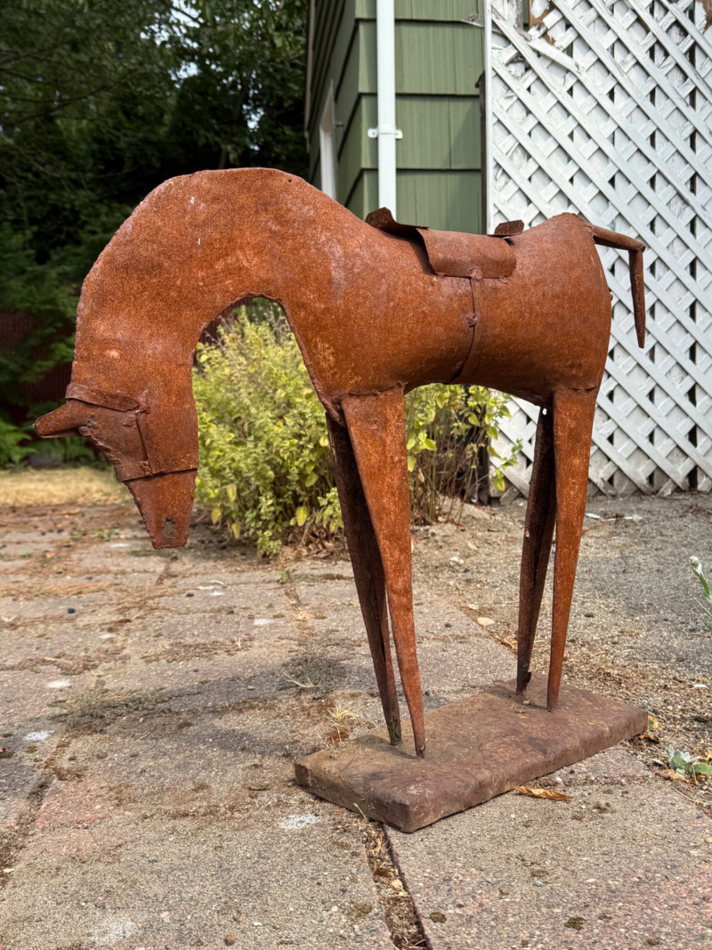 Vintage Folk Art Primitive Metal Horse Sculpture – Rustic Patina – Mid-Century Style This striking folk art metal horse sculpture captures the essence of primitive design with its hand-cut, minimalist form and natural rusted patina. Likely crafted in the mid-20th century or earlier, it’s a beautiful example of outsider art or American vernacular sculpture, often made by self-taught artists using repurposed materials. The horse features exaggerated proportions—elongated legs and a bowed head—evoking both strength and humility. The rustic base and saddle detail add character, while the natural corrosion speaks to decades of age and outdoor exposure. Details: Style: Primitive / Folk Art / Outsider Art Material: Hand-welded iron or steel with natural rust patina Estimated Era: Mid-century or earlier Dimensions: Approx. 18–22” tall, 14–18” wide Condition: Excellent patinated condition for age; solid and stable, with surface rust as expected Why It’s Special: