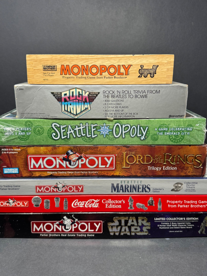 Vintage & Collector’s Board Game Bundle – Monopoly Editions + More A curated stack of iconic board games perfect for collectors, players, and pop culture enthusiasts. This lot includes 7 unique games, spanning themes from music to movies and regional nostalgia: Monopoly (Wood Box Edition) – Parker Brothers – Classic game with elegant wooden packaging. Rock Trivia – Pressman – Rock ’n’ roll trivia spanning The Beatles to Bowie. Includes 4,000 questions across 8 categories. Seattle-Opoly – Late 1990s–2000s – A regional twist on Monopoly, celebrating Emerald City landmarks and quirks. Monopoly: Lord of the Rings Trilogy Edition – Parker Brothers – Includes movie-themed locations and custom tokens. Monopoly: Seattle Mariners Collector’s Edition – Includes collectible pewter tokens and team references. Monopoly: Coca-Cola Collector’s Edition – Parker Brothers – Featuring iconic Coke branding and themed game pieces. Monopoly: Star Wars Limited Collector’s Edition – Features pewter Star Wars tokens, galactic currency, and a themed board. Era: Mostly late 1990s–2000s