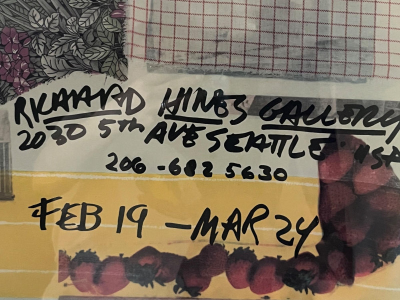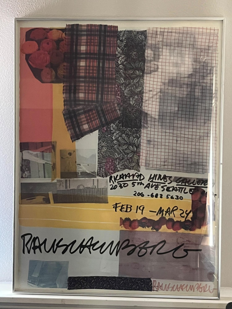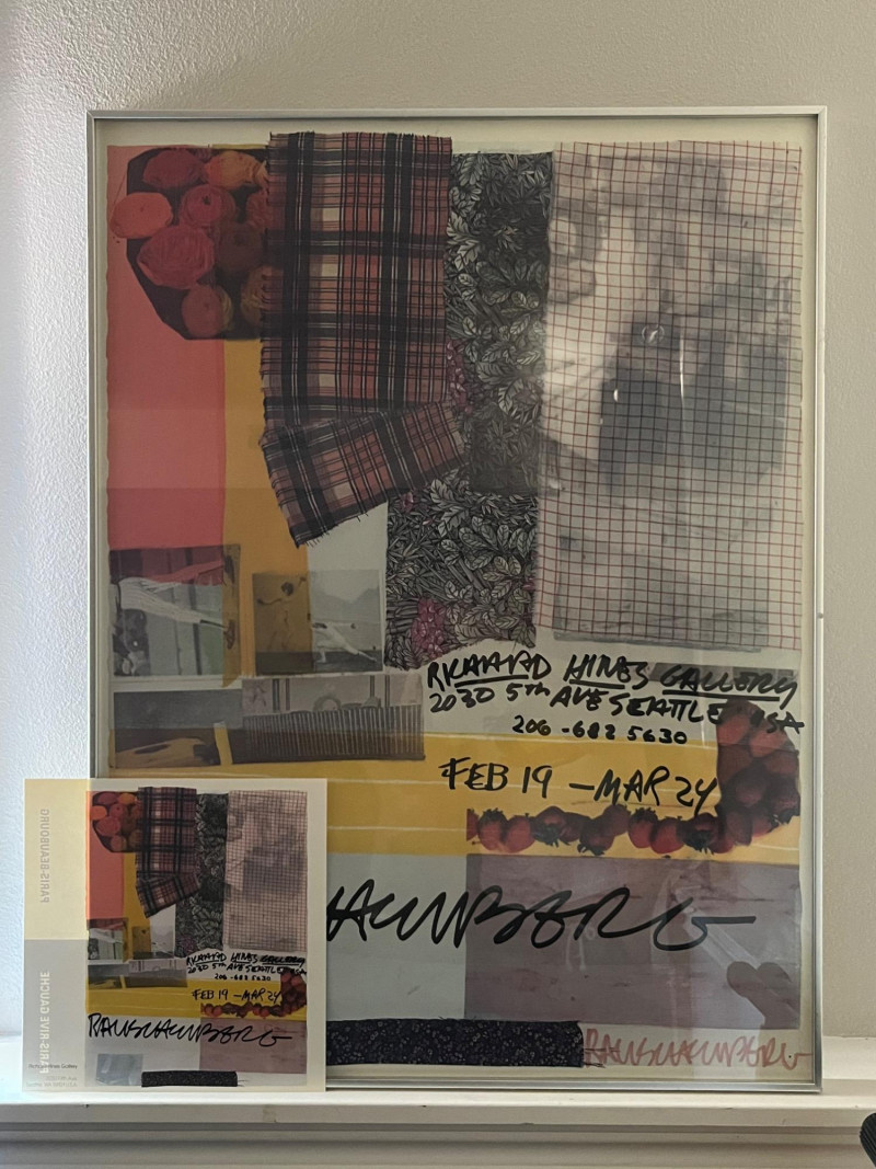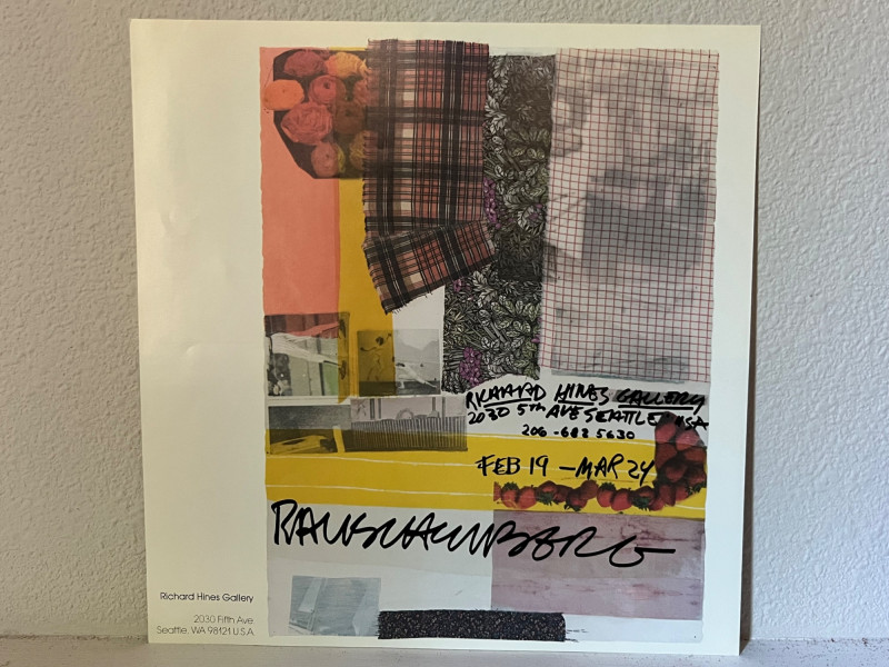 Original Lithograph by famous American graphic artist Robert Rauschenberg (1925-2008). Part of a limited edition of only 100. Valued anywhere from $3,000-$4,500 by galleries and auction houses. Includes promotional poster of the Richard Hines Gallery featuring the lithograph. Handwritten details—such as the gallery address, exhibition dates, and Rauschenberg’s signature are prominently featuring on the art. Mixed media details of plaid, florals and fruits come together in a muted pastel collage style, a hallmark of Rauschenberg's vision. Rauschenberg received numerous awards during his nearly 60-year artistic career. Among the most prominent were the International Grand Prize in Painting at the 32nd Venice Biennale in 1964 and the National Medal of Arts in 1993. Family collected poster at the time of the exhibition.