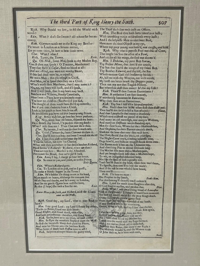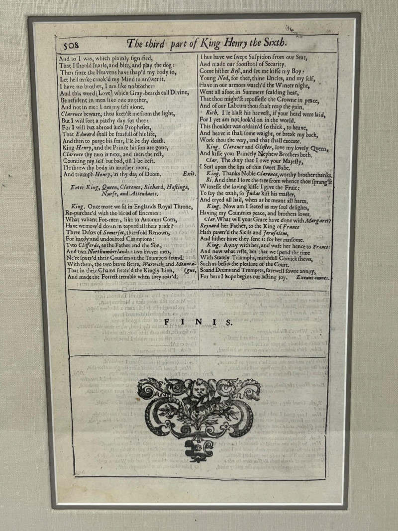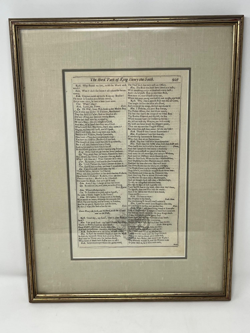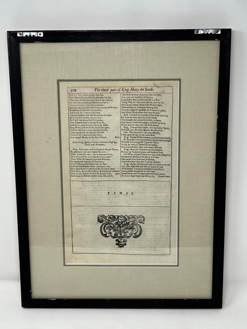 Double sided framed page from Shakespeare's King Henry The 6th First Foilio (1st Edition). Page 507 & 508. Text bleeds through on both sides but it is very legible. Other examples exhibit the same factory flaws. Matted and framed in glass, this is a very-well preserved page from literary history.