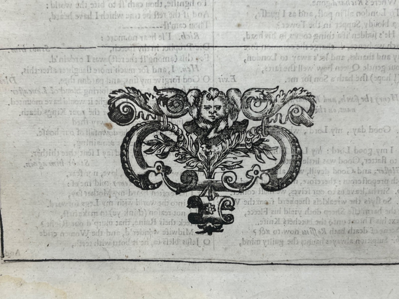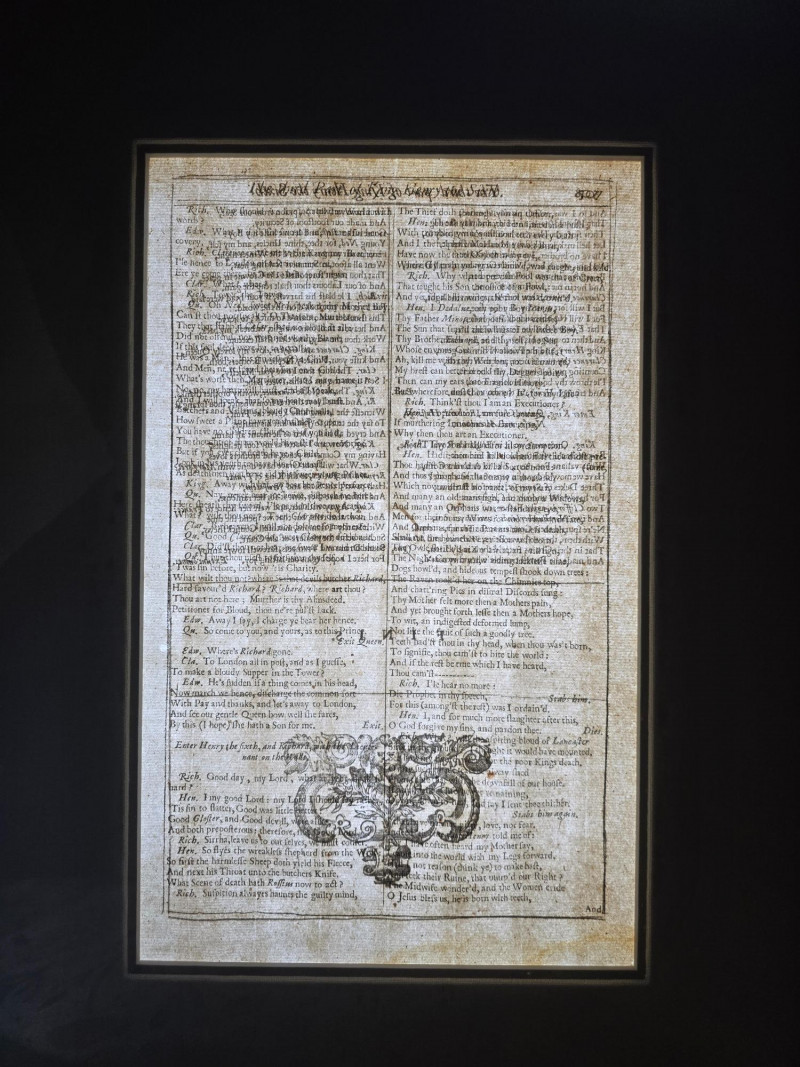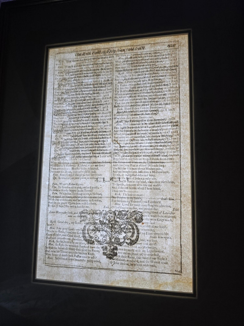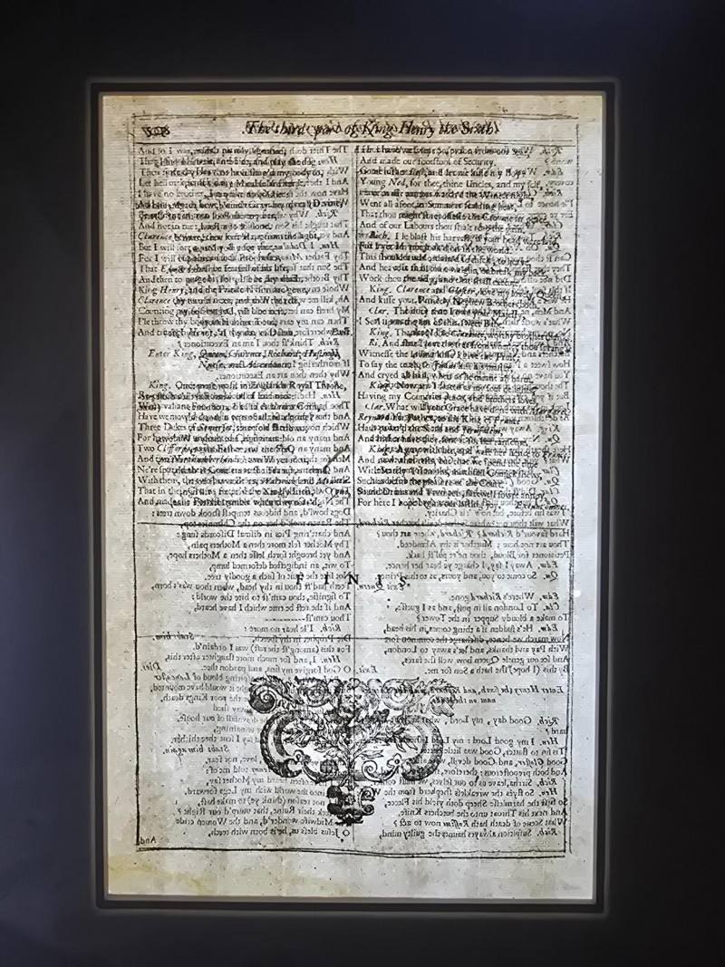Double sided framed page from Shakespeare's King Henry The 6th First Foilio (1st Edition). Page 507 & 508. Text bleeds through on both sides but it is very legible. Other examples exhibit the same factory flaws. Matted and framed in glass, this is a very-well preserved page from literary history.
