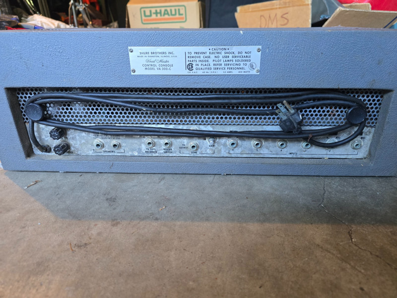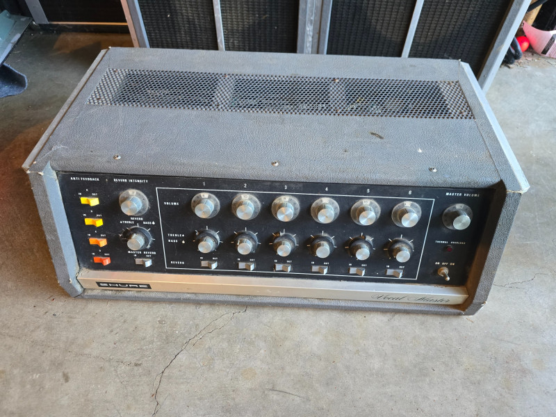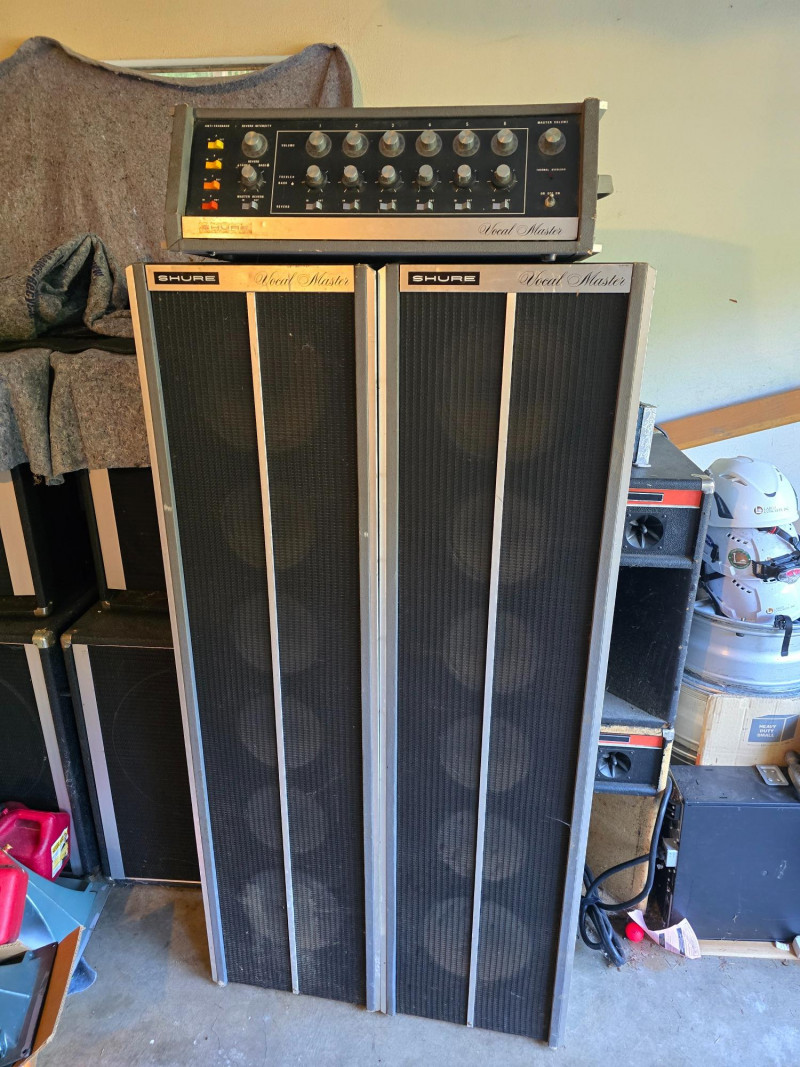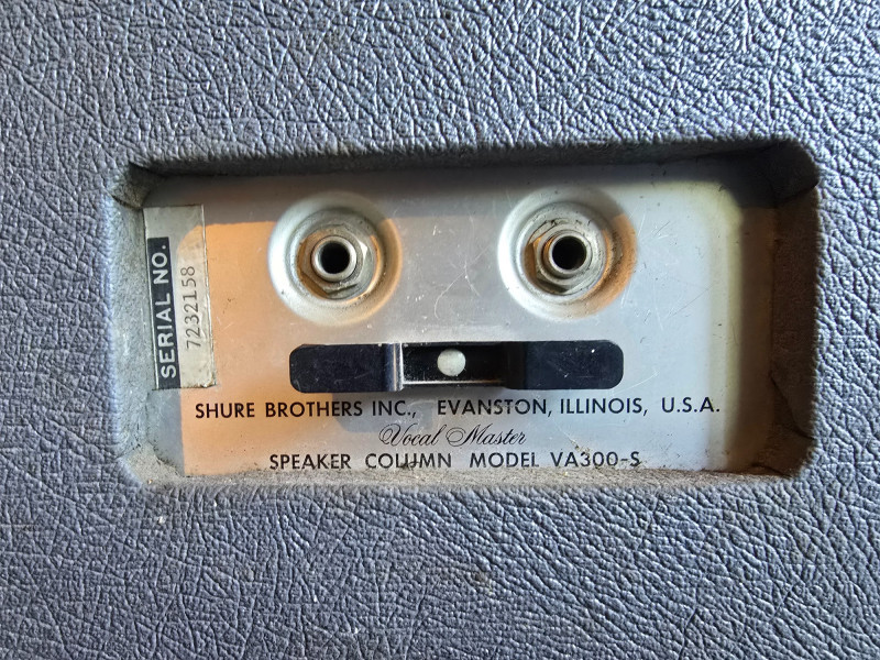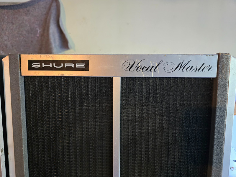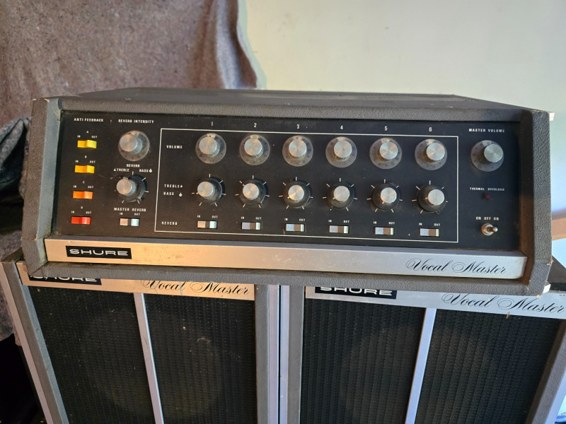 Vocal Master PA System w/Voice Gate Unit, Reverb, and 2 Tower Speakers. Shure VA300C Vocal Master Head. The Shure VA300C is a vintage, solid-state 100-watt RMS powered mixer and amplifier head from Shure's Vocal Master PA system, popular in the late 1960s and 1970s for live bands and venues. It features six microphone inputs, individual volume, tone, and reverb controls for each channel, and built-in protection for its power amplifier components. This classic PA head is sought after by vintage audio enthusiasts for its sound and ability to handle vocals and instruments for small to medium-sized gigs.