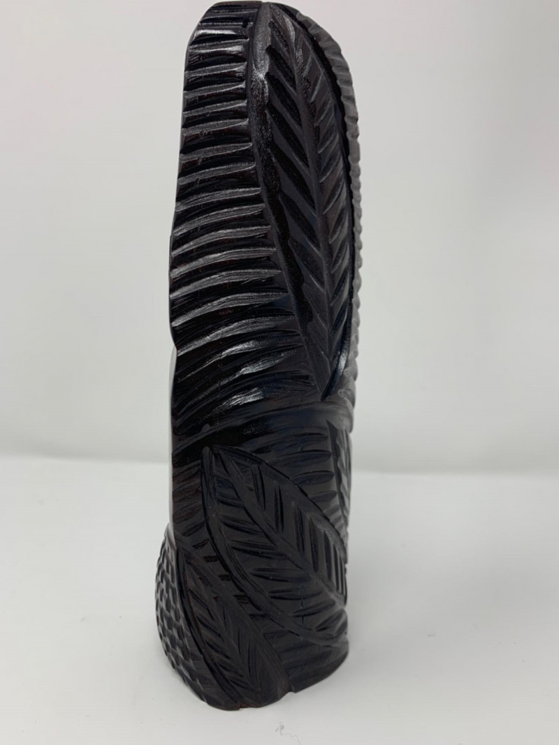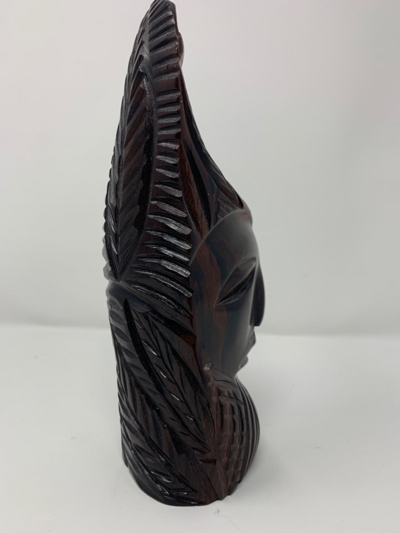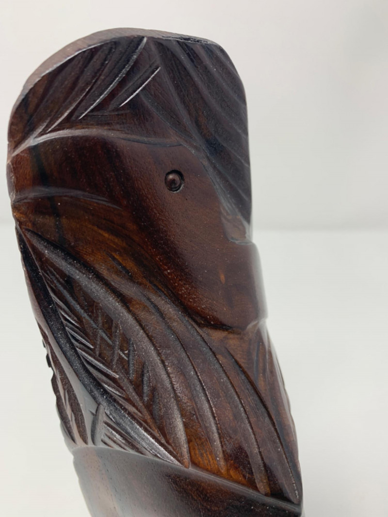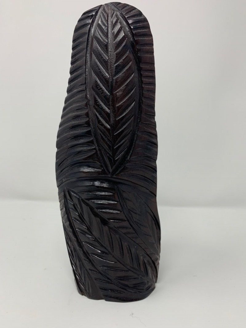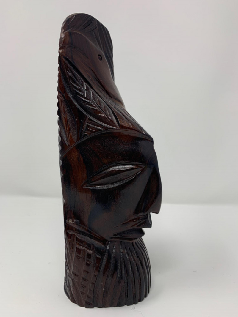 A Belize wood carved sculpture of bird man called Toucan Man. Tropical leaves and feathers hand carved around his head. Special wood only found in Belize- Zericote wood. Made in Belize in the Alton Ha site signed by T Herbert.