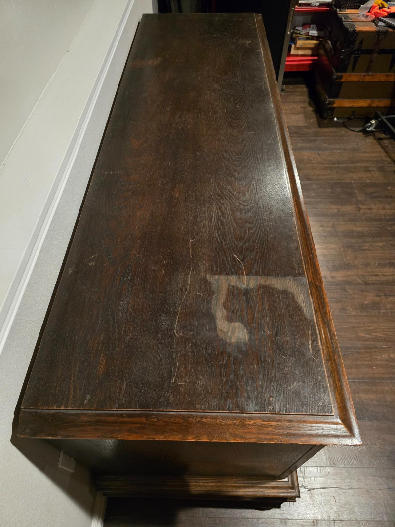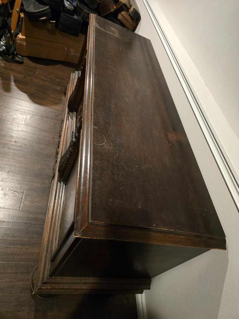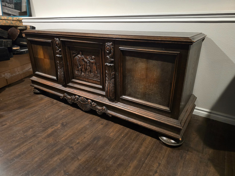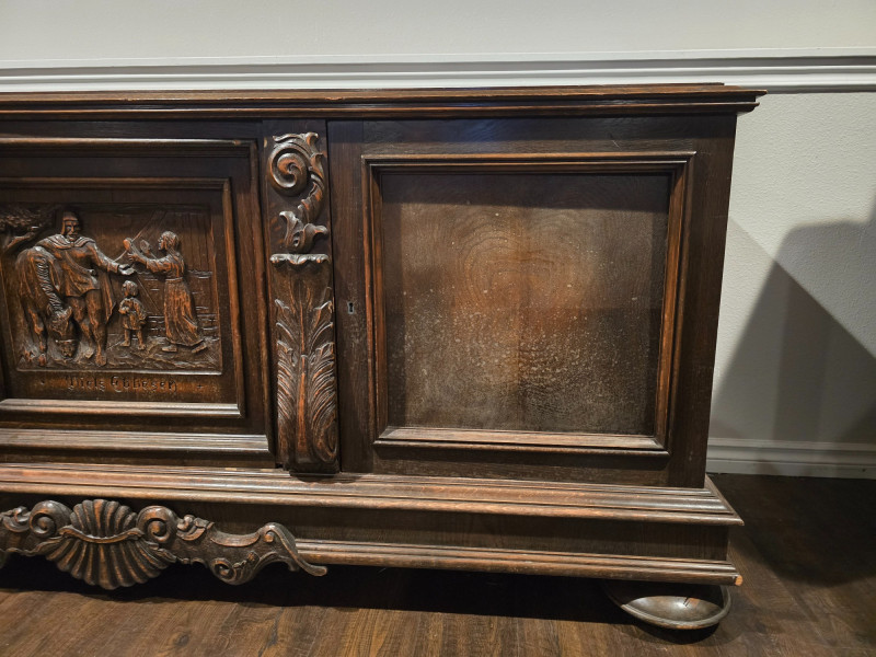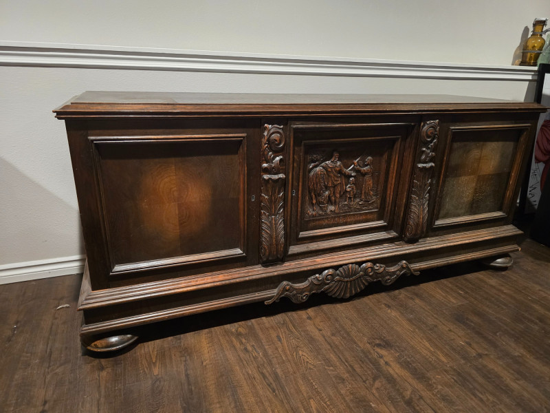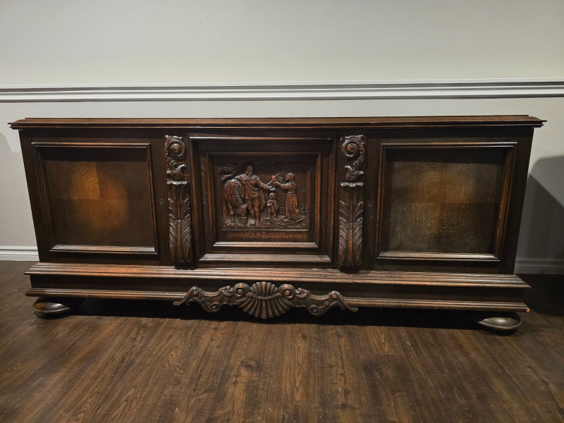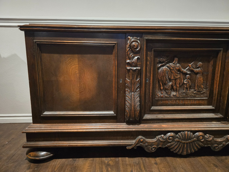 Large, solid wood buffet cabinet. Measuring 77x23x33, it is a large statement piece for any home. 3 door cabinet, with shelving inside for storage needs of all kinds. There is no locking mechanism, the keyholes are for show. Some wear on the piece due to age and use, with a wood stain on the surface in a corner- see last photo. Center cabinet door features a carving with the name "Niels Ebbesen". Niels was a Danish squire, known for his assassination of Gerald III, in 1340. The death of the Count of Helstein-Rendsburg meant the end of Holstein rule in Denmark. Today, he is seen as a national hero, with streets named in his honor, as well as many paintings and statues. A great piece of Scandinavian history that will surely create conversation to any who bring this piece home.