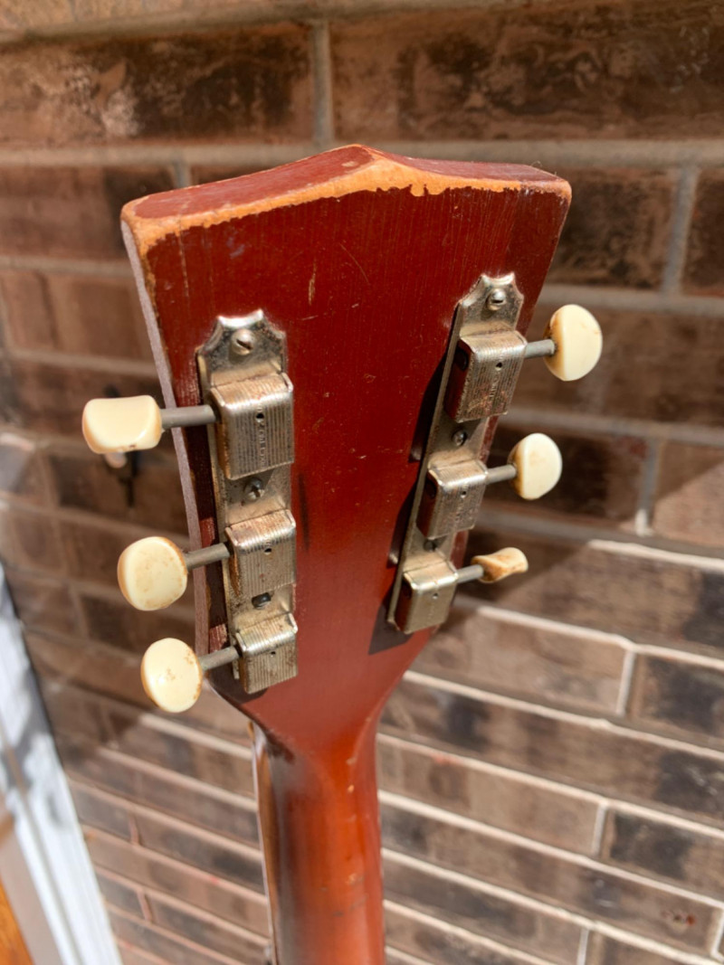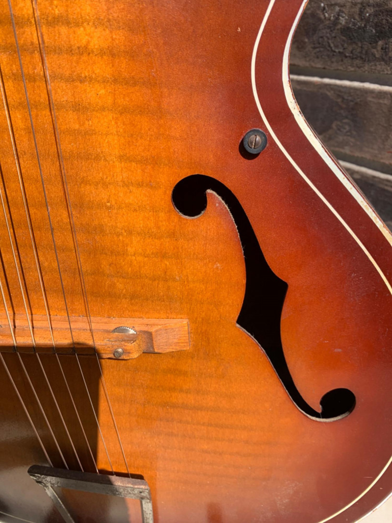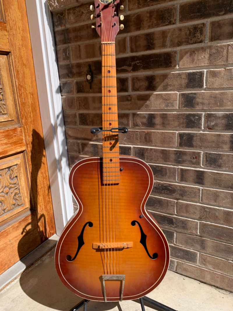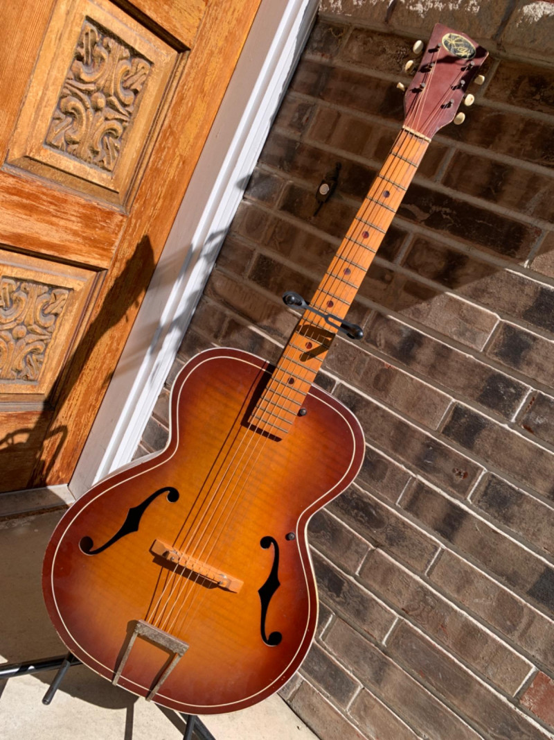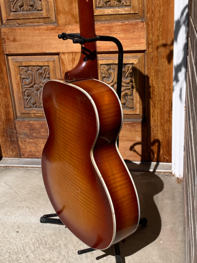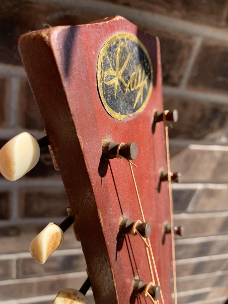 Kay Archtop Acoustic Project Guitar from the mid-20th century. Key features and details about this type of guitar include Archtop Design. It features an arched top and back, which is characteristic of archtop guitars and contributes to its acoustic properties. Kay was a well-established Chicago-based company known for supplying instruments to retailers. Vintage Condition! The guitar shows signs of age, consistent with vintage instruments, scuffs and dings. The neck is pulling away from the body. There is a gap. The guitar will need a neck reset and it is being sold as a project guitar.