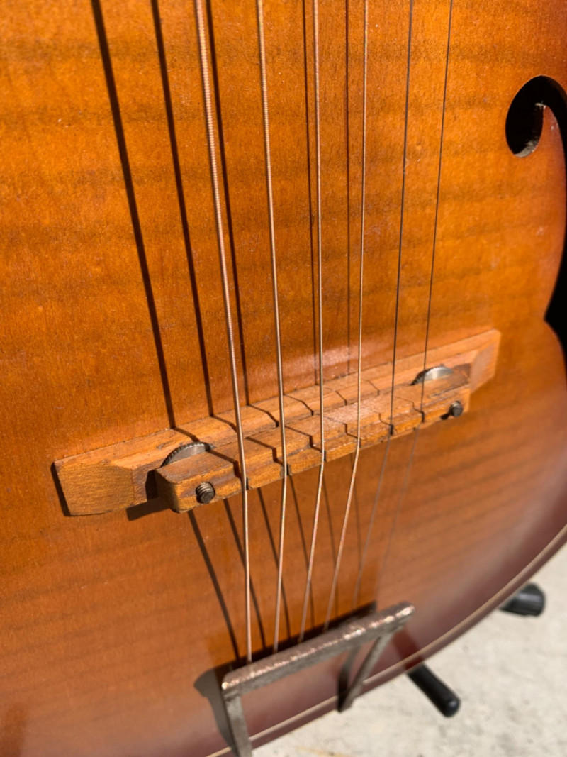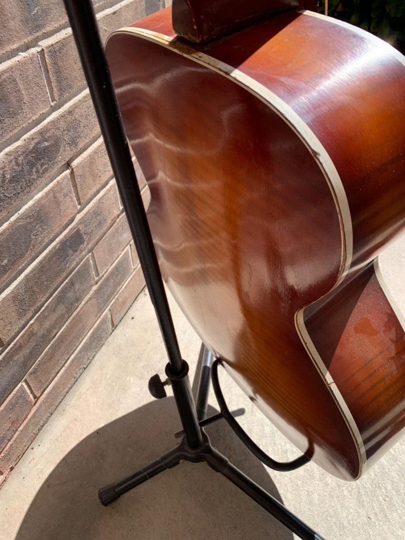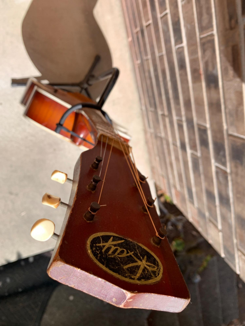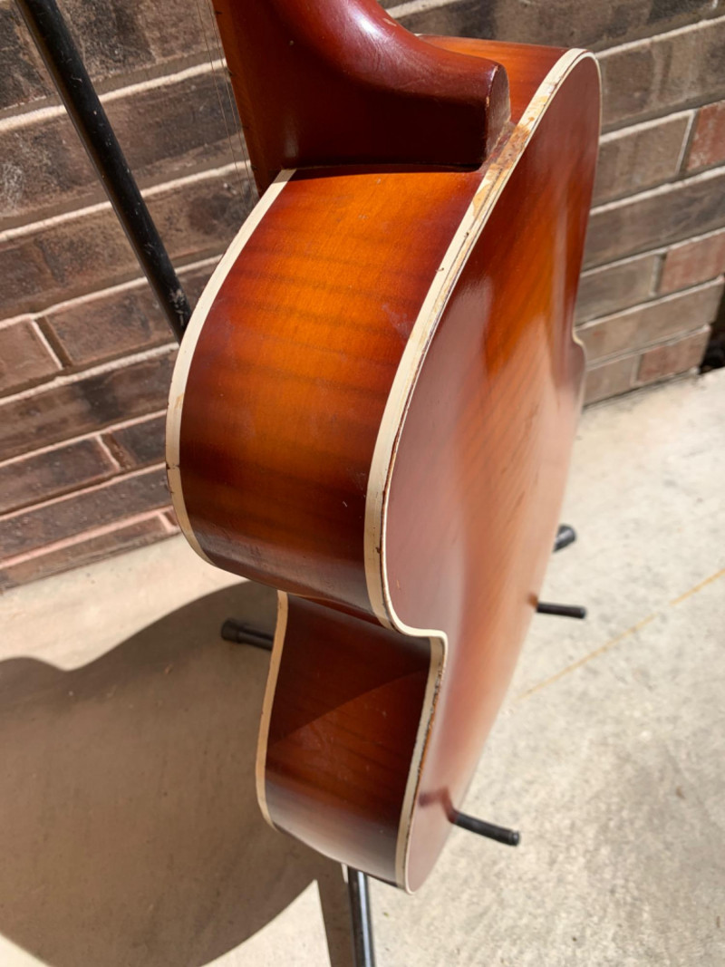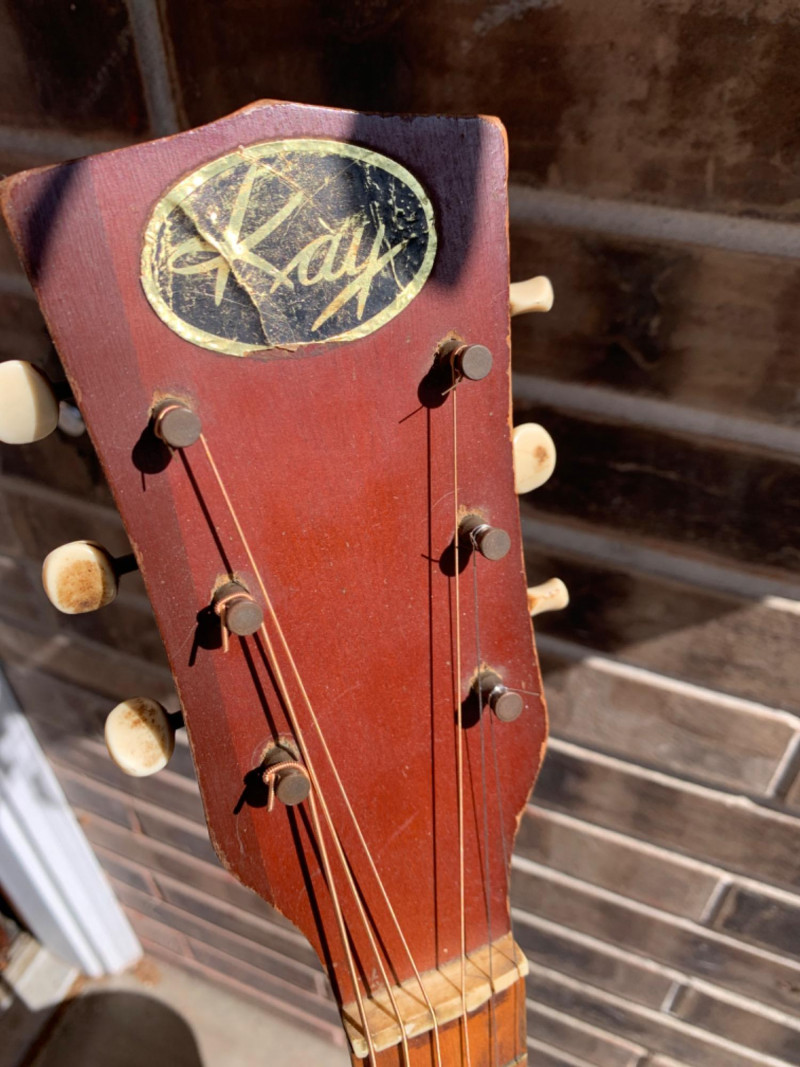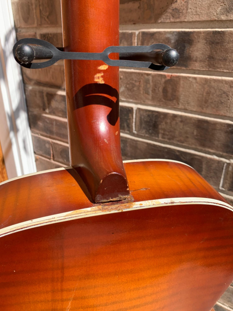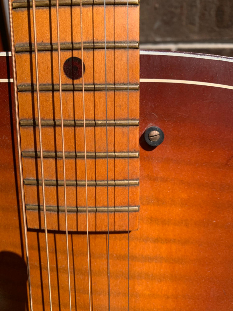 Kay Archtop Acoustic Project Guitar from the mid-20th century. Key features and details about this type of guitar include Archtop Design. It features an arched top and back, which is characteristic of archtop guitars and contributes to its acoustic properties. Kay was a well-established Chicago-based company known for supplying instruments to retailers. Vintage Condition! The guitar shows signs of age, consistent with vintage instruments, scuffs and dings. The neck is pulling away from the body. There is a gap. The guitar will need a neck reset and it is being sold as a project guitar.