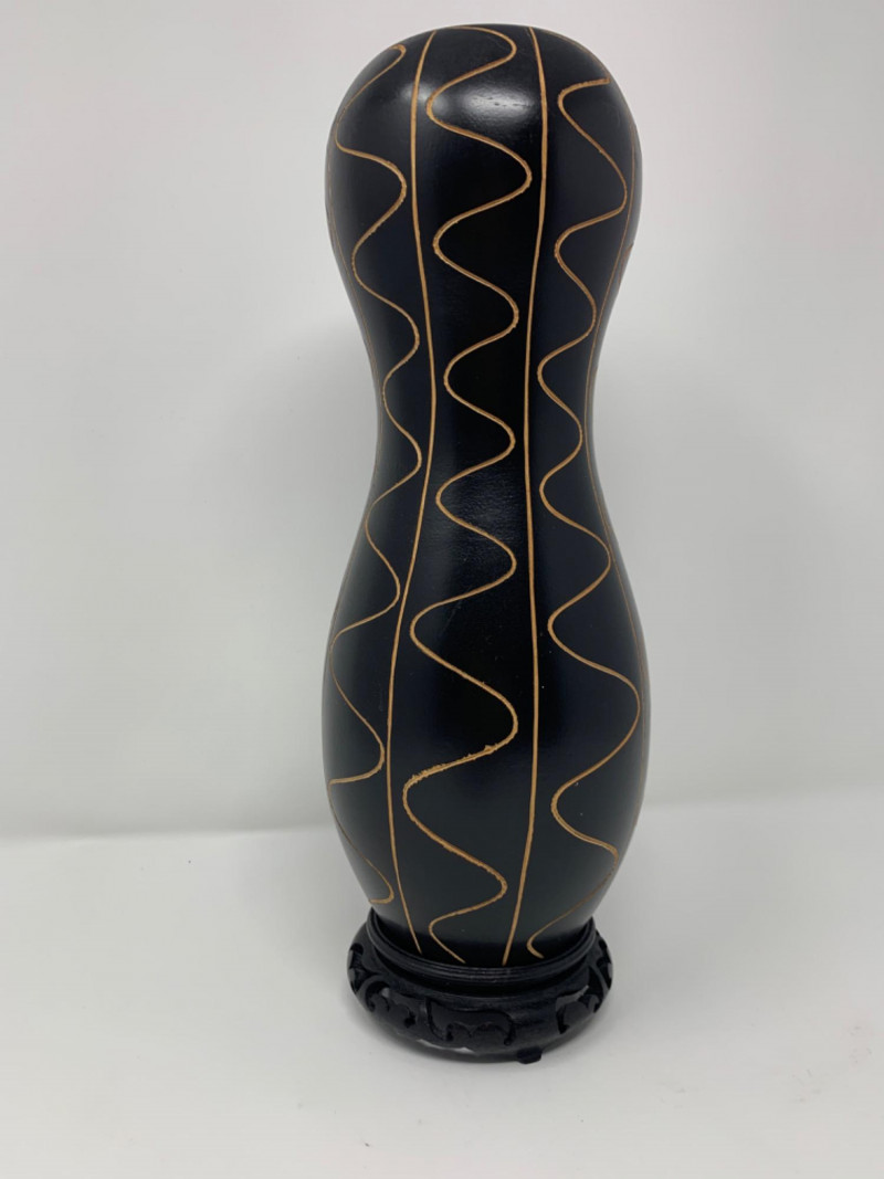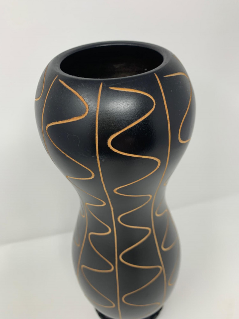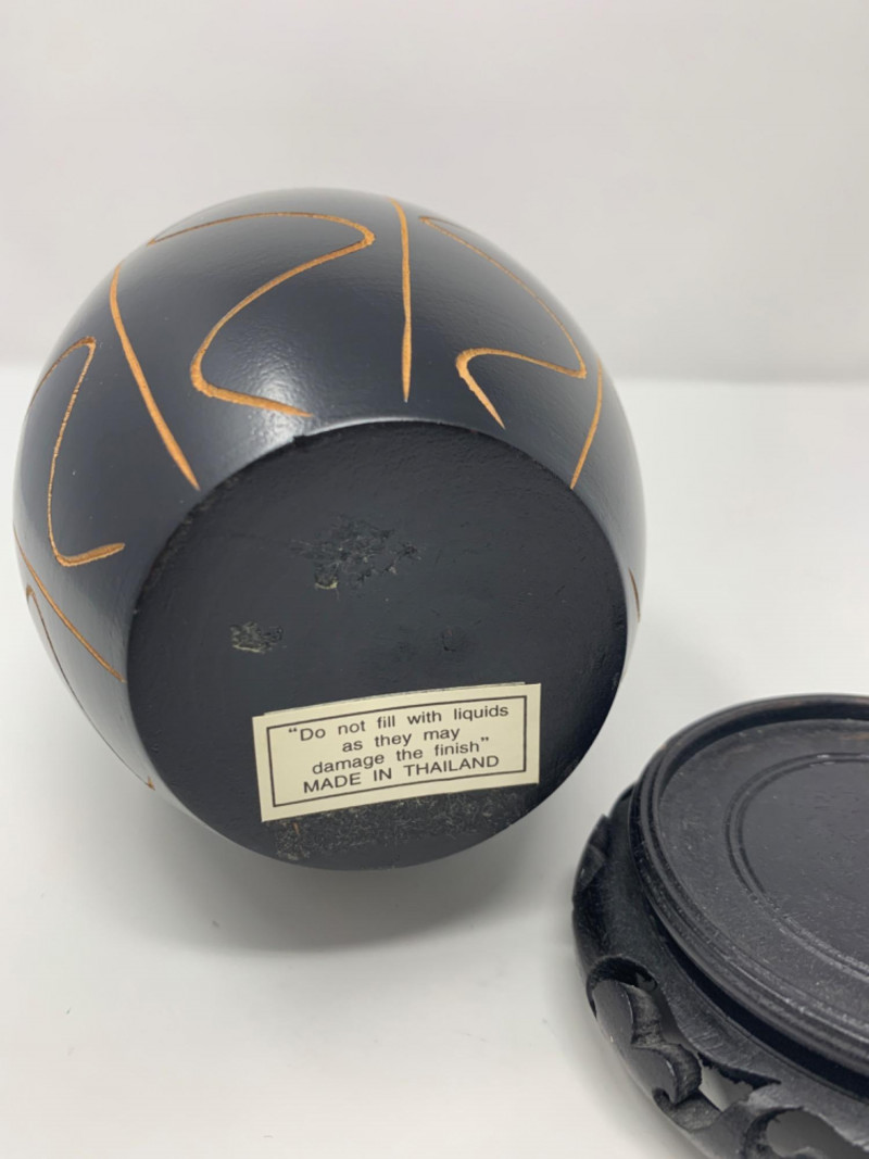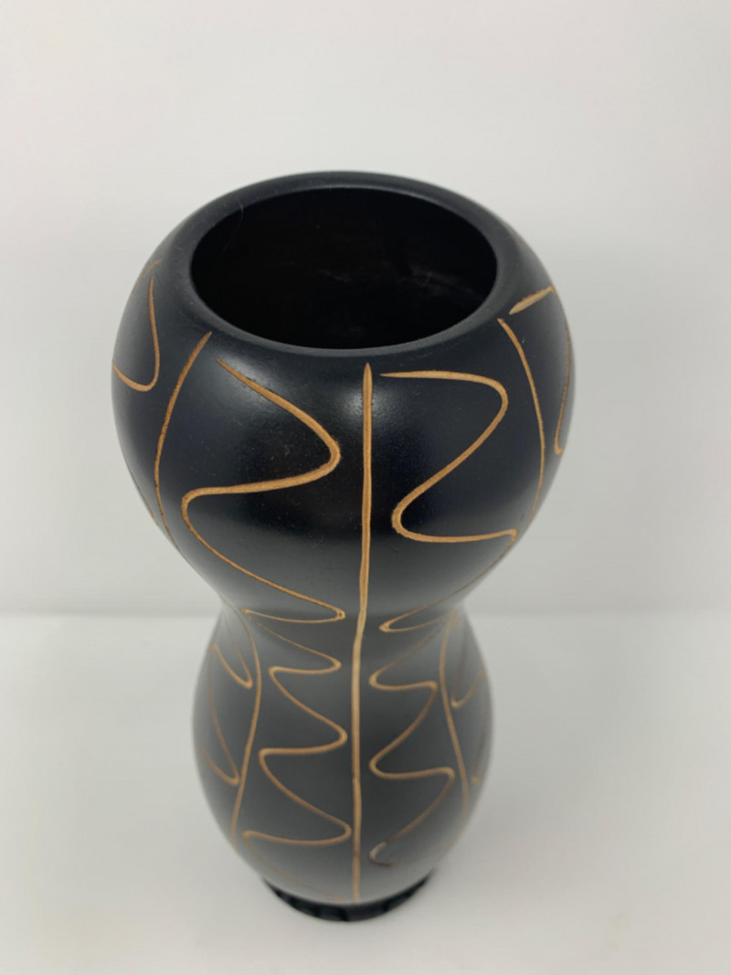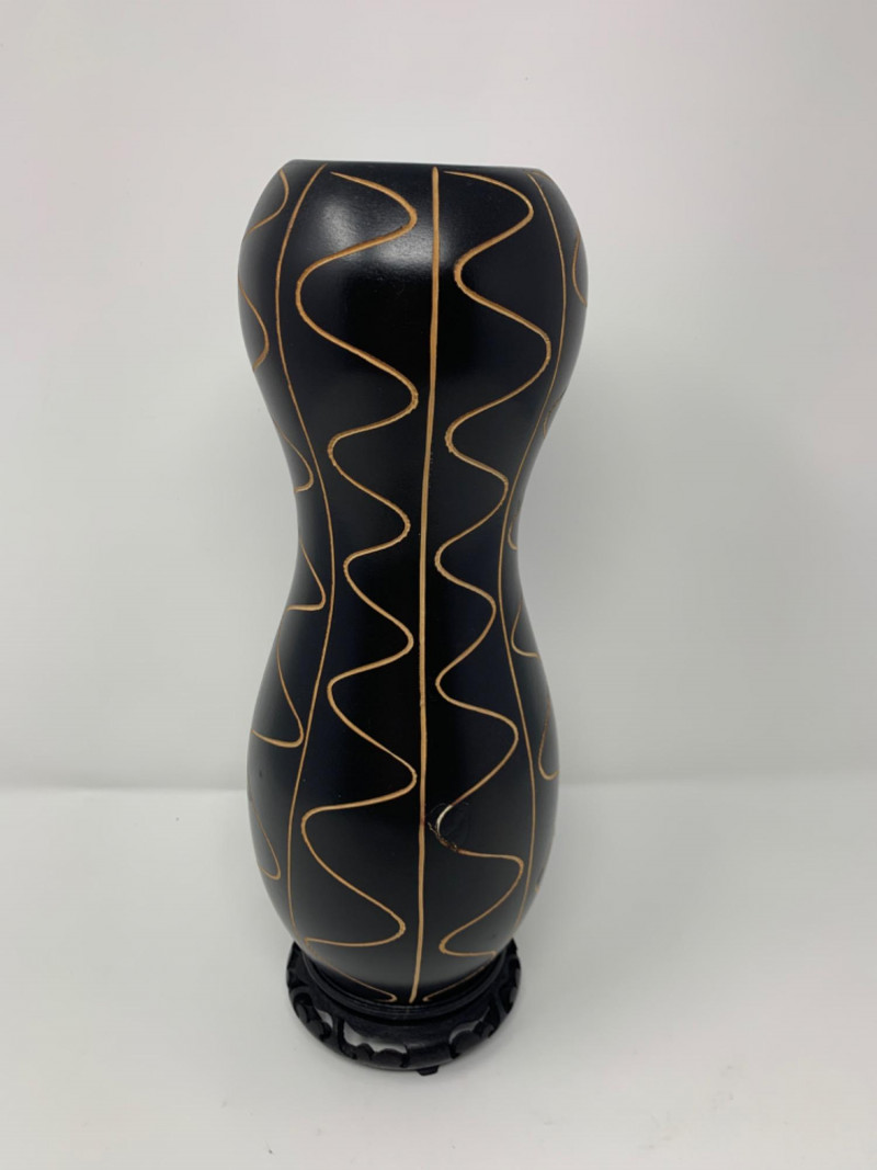 Wood Vase From Thailand; Made from Mango Wood. Black curved vase with striking etching waves vertically running downward.