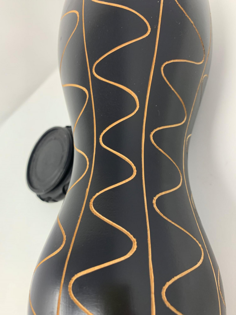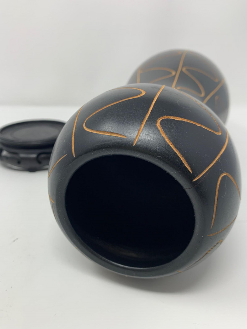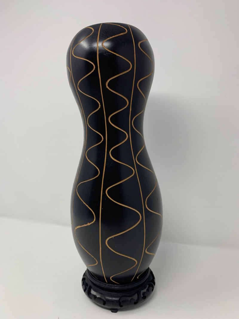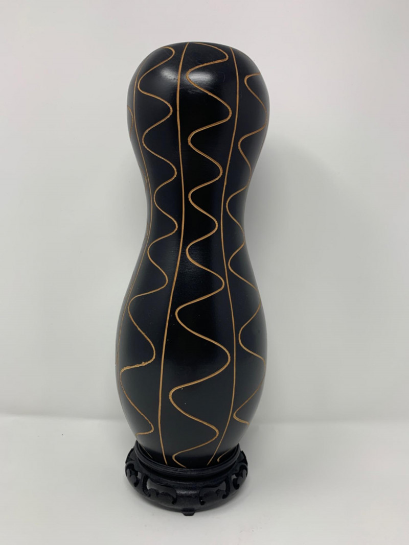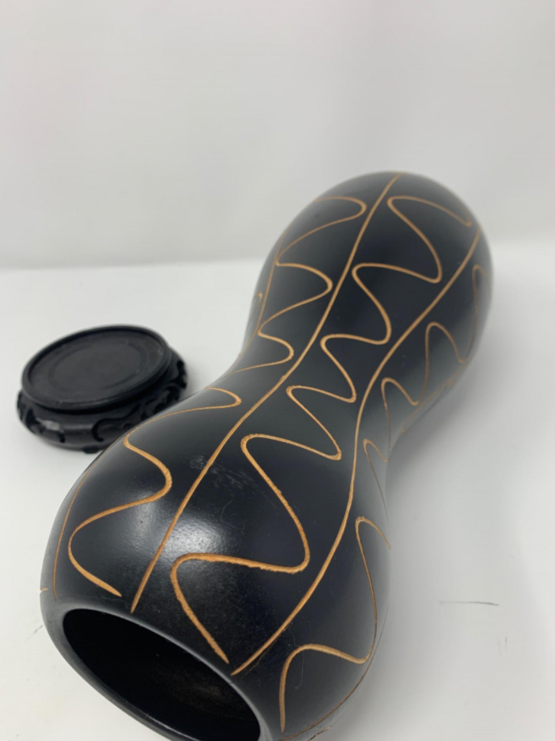 Wood Vase From Thailand; Made from Mango Wood. Black curved vase with striking etching waves vertically running downward.