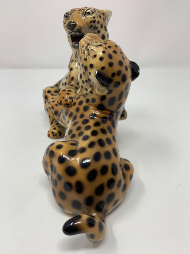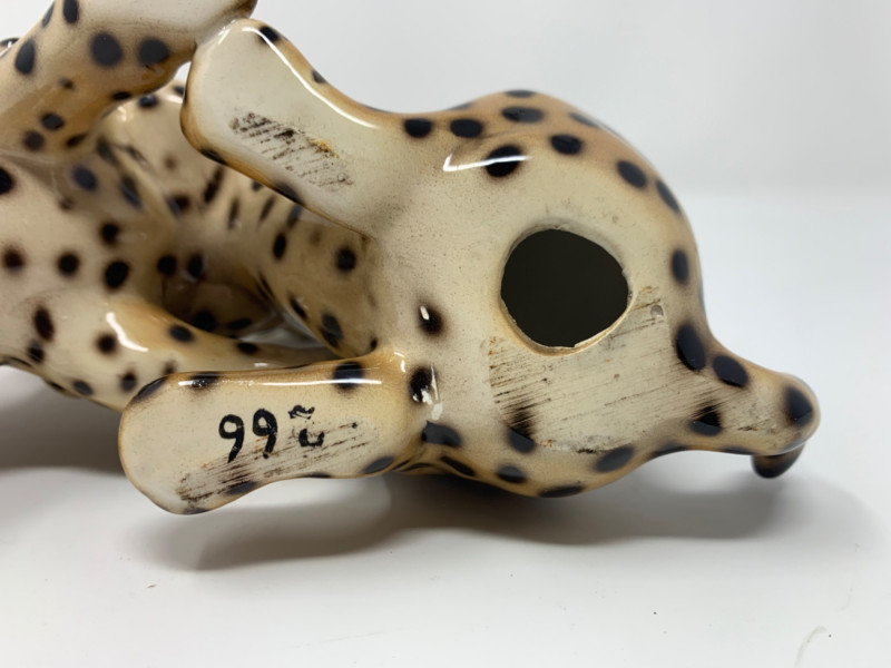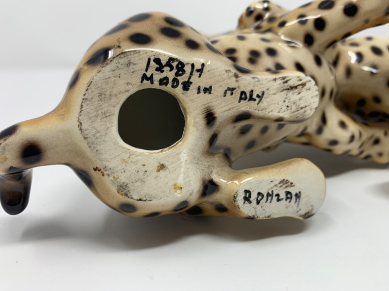 Vintage Giovanni Ronzan, a renowned Italian ceramic artist who, along with his brothers, founded the Ronzan Ceramic Studio in Turin, Italy, in the 1930s. G. Ronzan was known for his delicate realism and quality craftsmanship, producing expressive and detailed ceramic animals and figurines including pieces like this leopard sculpture, is highly sought after by mid-century modern collectors due to its lifelike detail and handcrafted finish. Small imperfections. Beautiful design. Realistic quality.