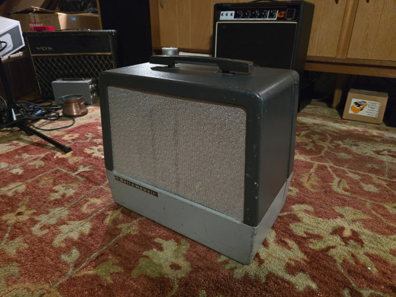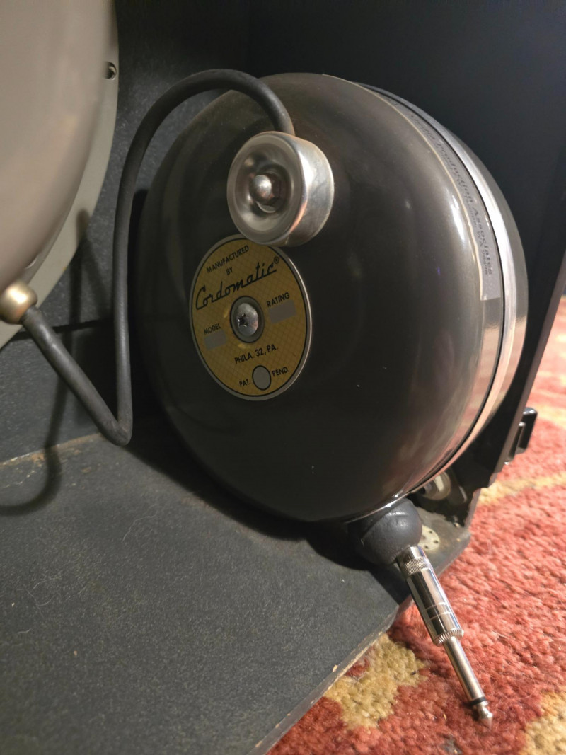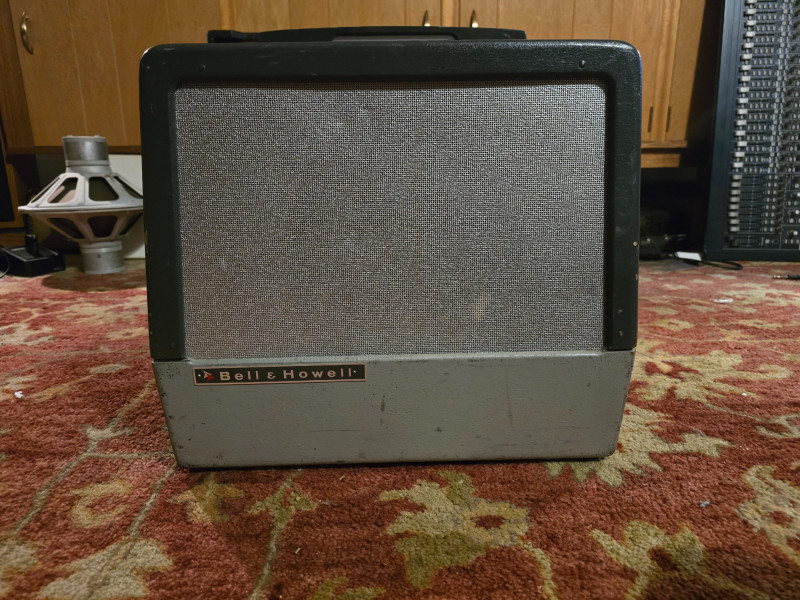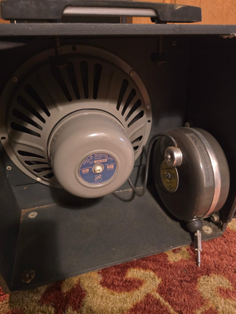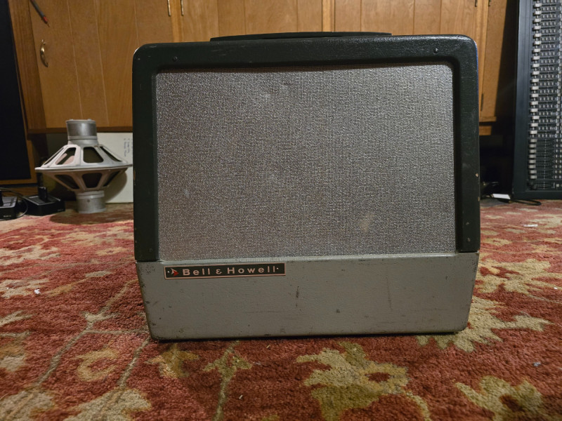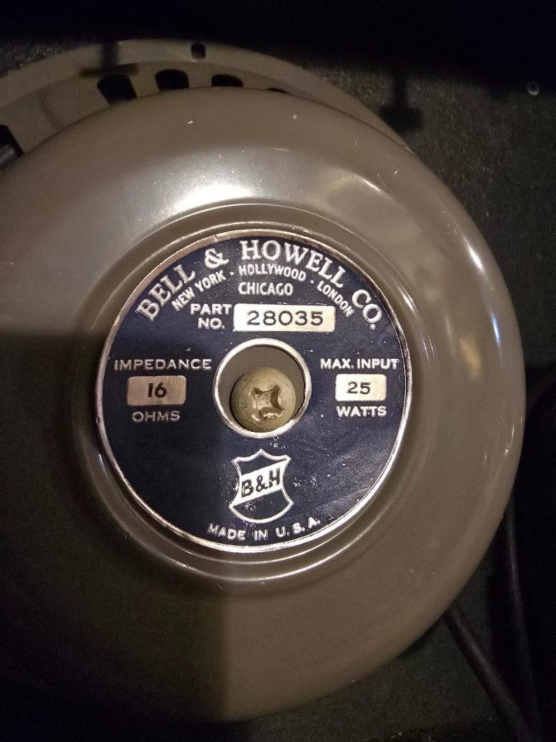 Here we have an original Bell and Howell Filmosound speaker cabinet. Includes the original and fully functional Bell and Howell stamped Jensen P12P 12" speaker. These old Jensens are very sought after alnico speakers and this one is in excellent shape and sounds marvelous. Speaker connection can't get any easier than use with the retractable speaker system by cordomatic. Speaker is 25 Watts @ 16 Ohms.