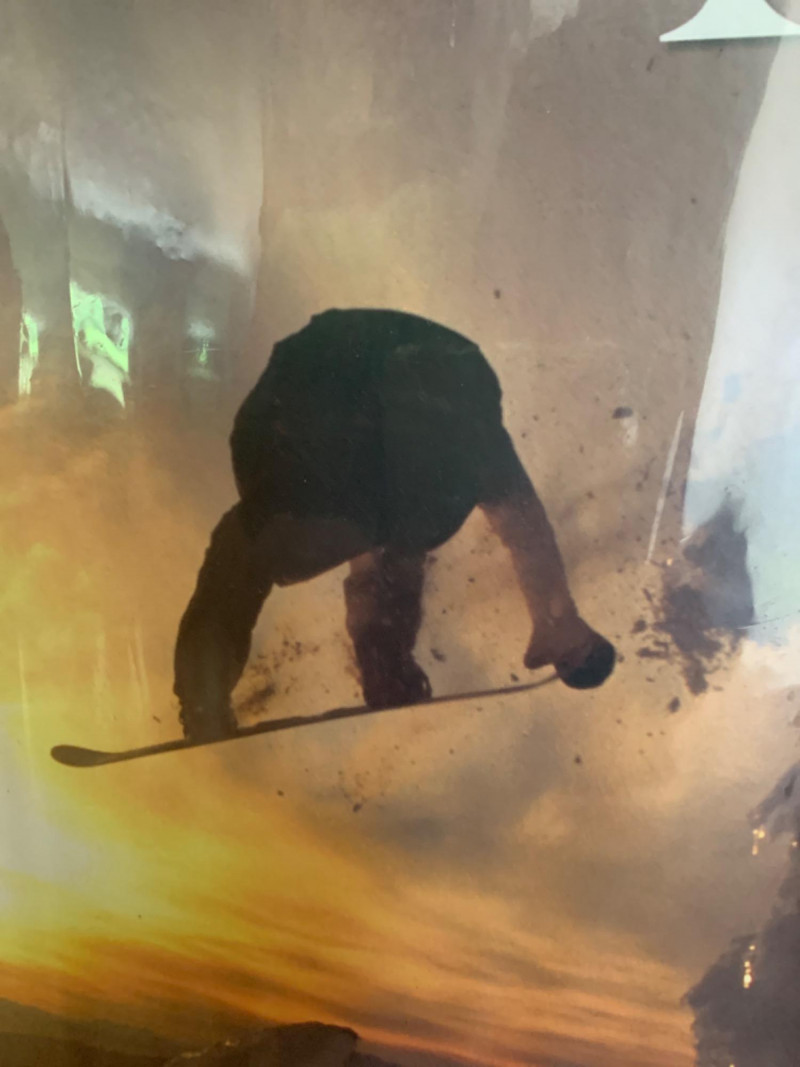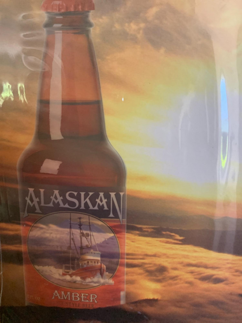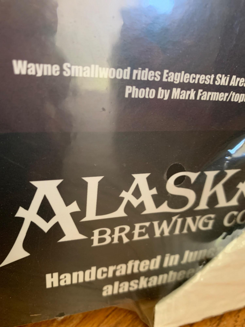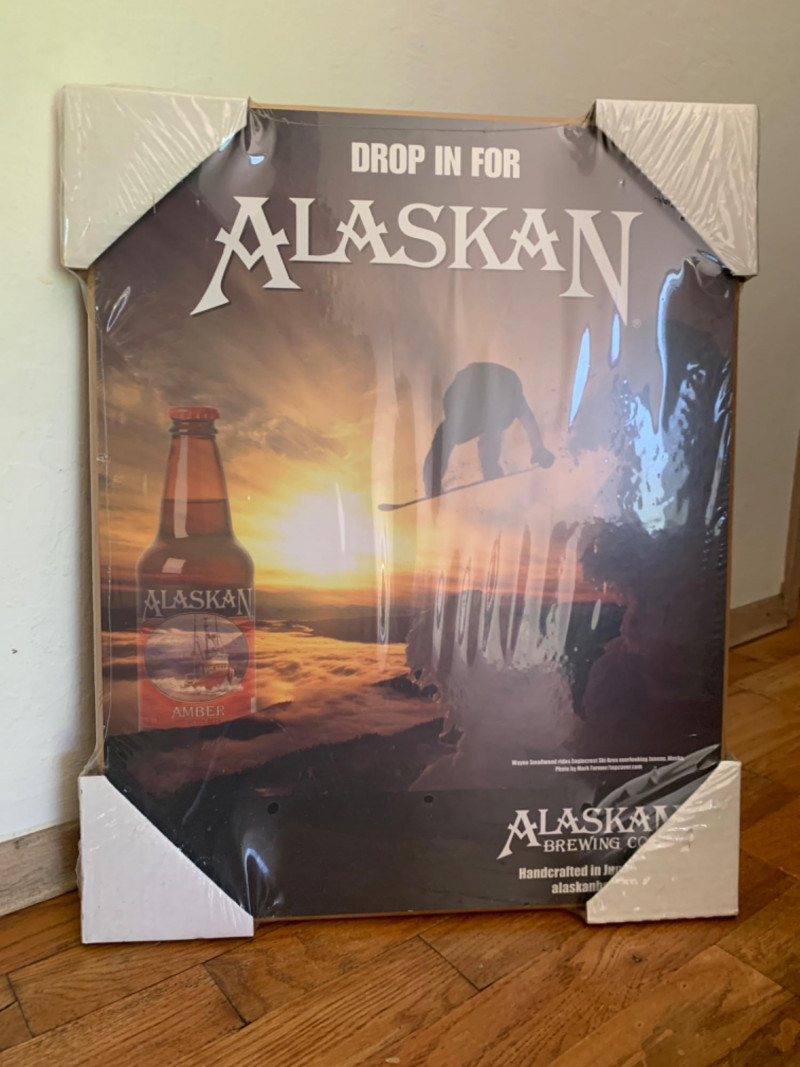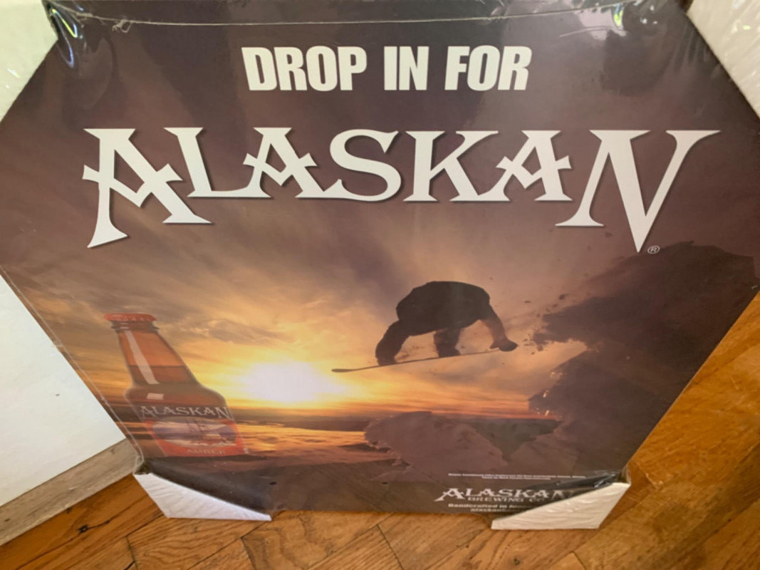 Framed advertisement for Alaskan Brewing Co. Amber Alt Style Ale. The image on the advertisement features a snowboarder and a bottle of Alaskan Amber beer with the slogan "DROP IN FOR ALASKAN” perfect for the man cave or the garage. Corners are protected with cardboard. It’s shrunk wrapped in its packaging.