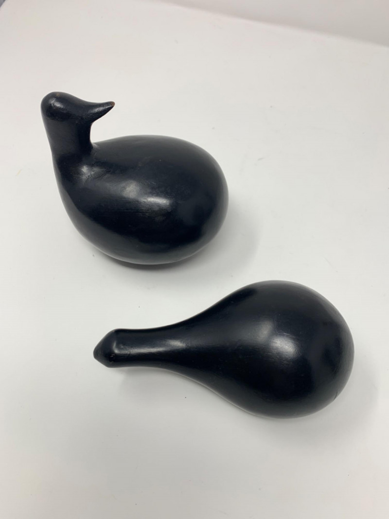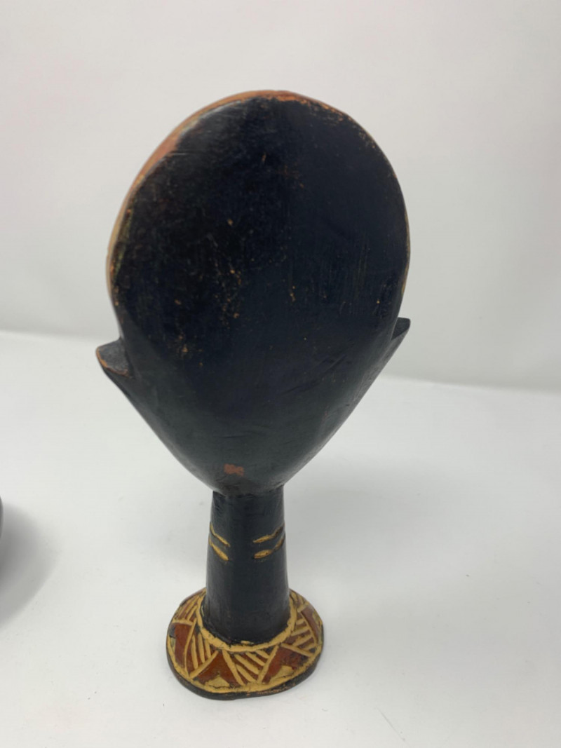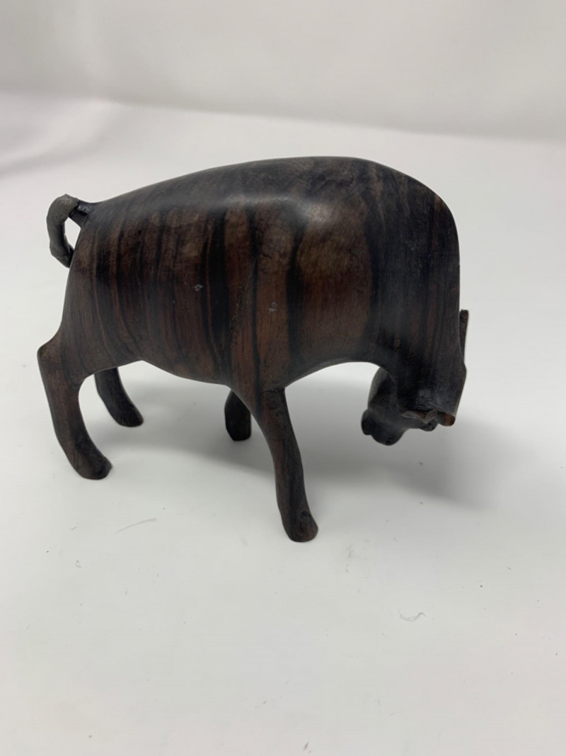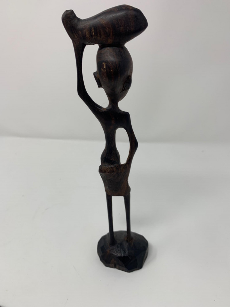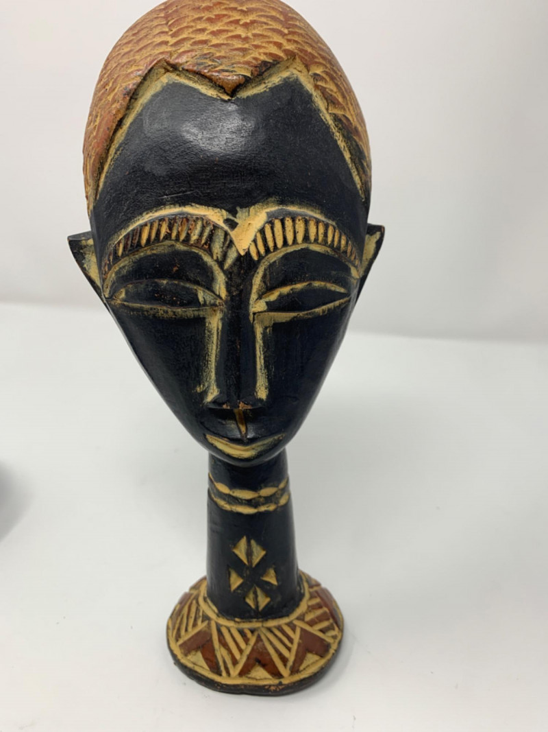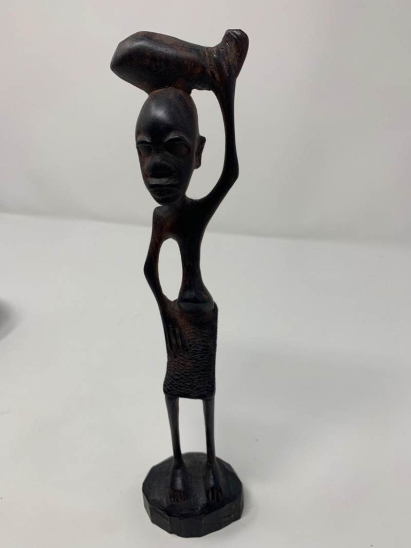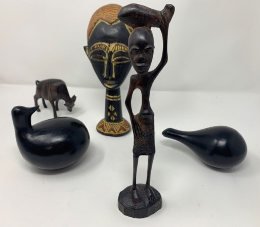 African tribal man with fish. Water buffalo. African head sculpture, a bird and an erotic sculpture.
