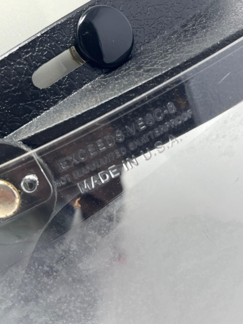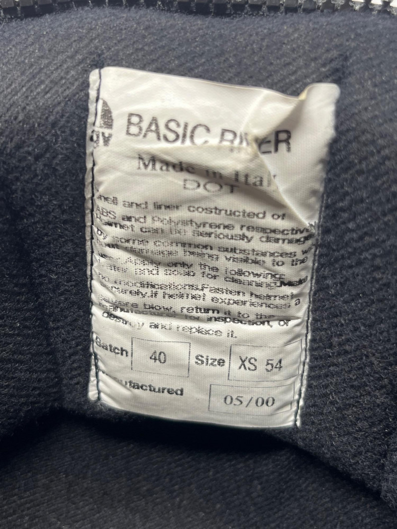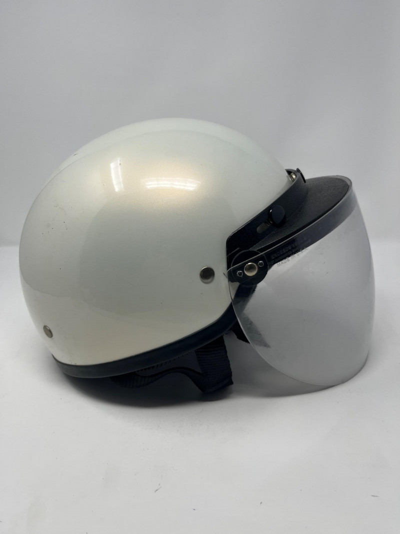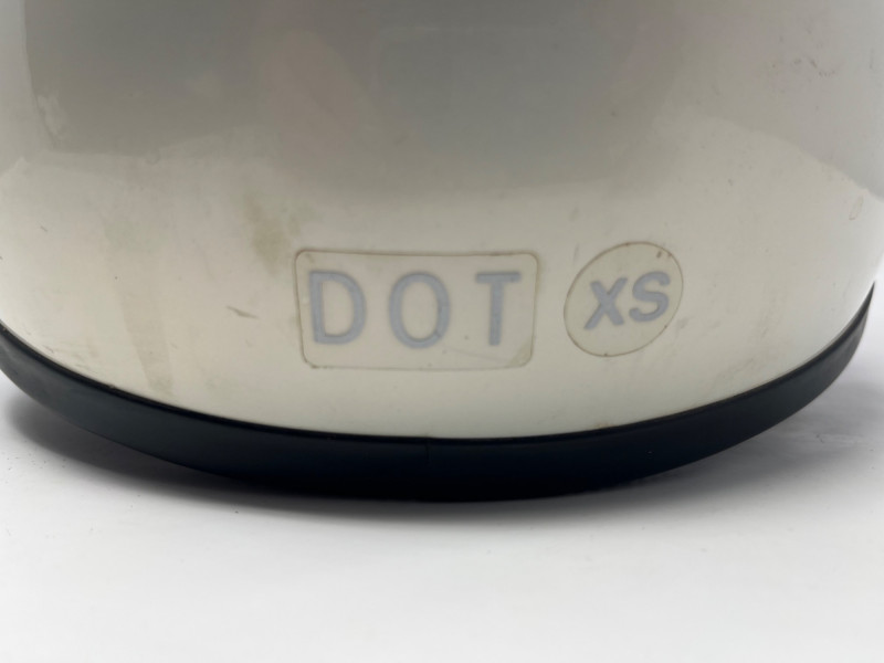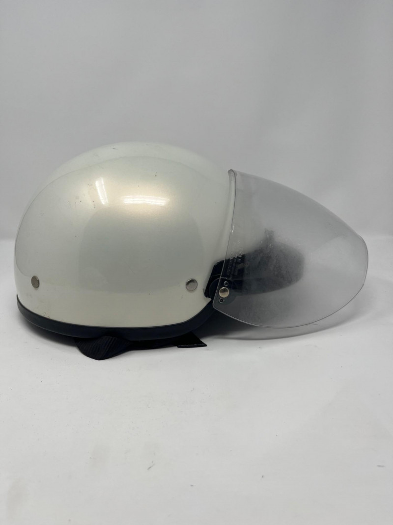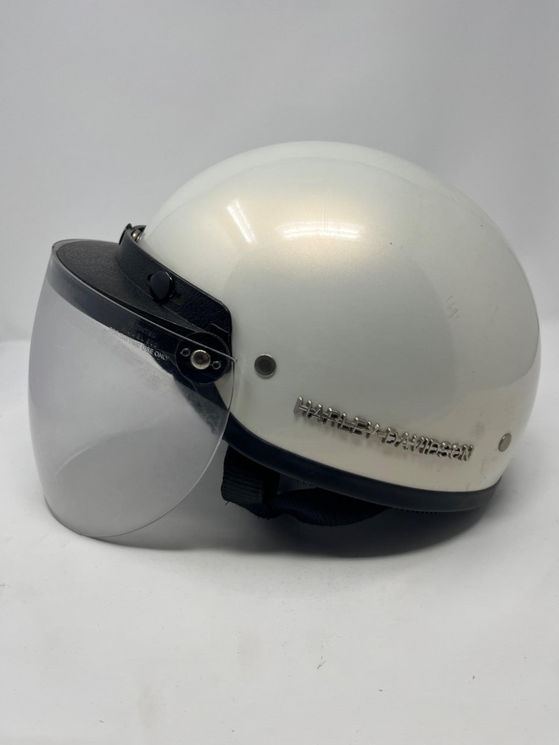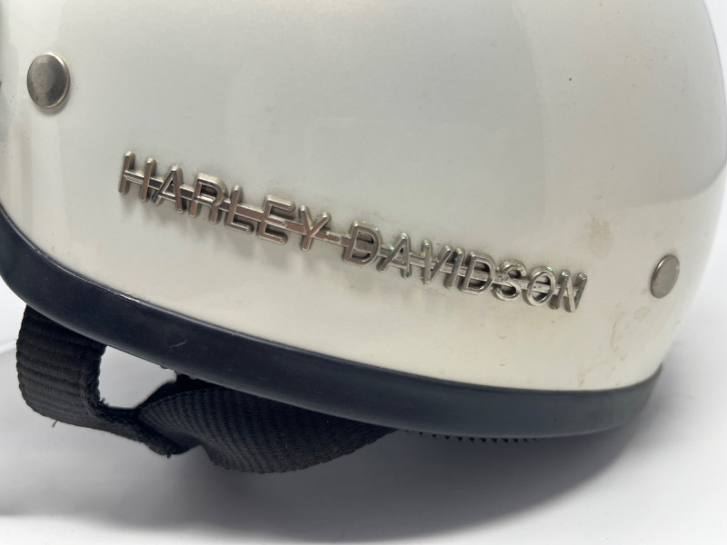Vintage Harley Davidson half-shell helmet with face shield and dust cover bag. Made in Italy, it is a size XS and DOT certified. Double loop closure is tight and secure on the head, and visor can be lifted or lowered as desired. Harley Davidson branding is visible on the helmet at well as the cover. No damage, just light wear scuffing due to age.