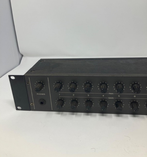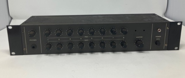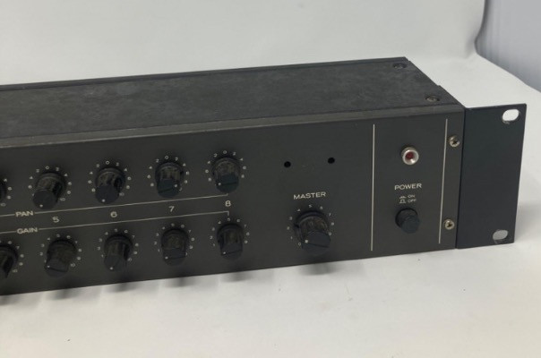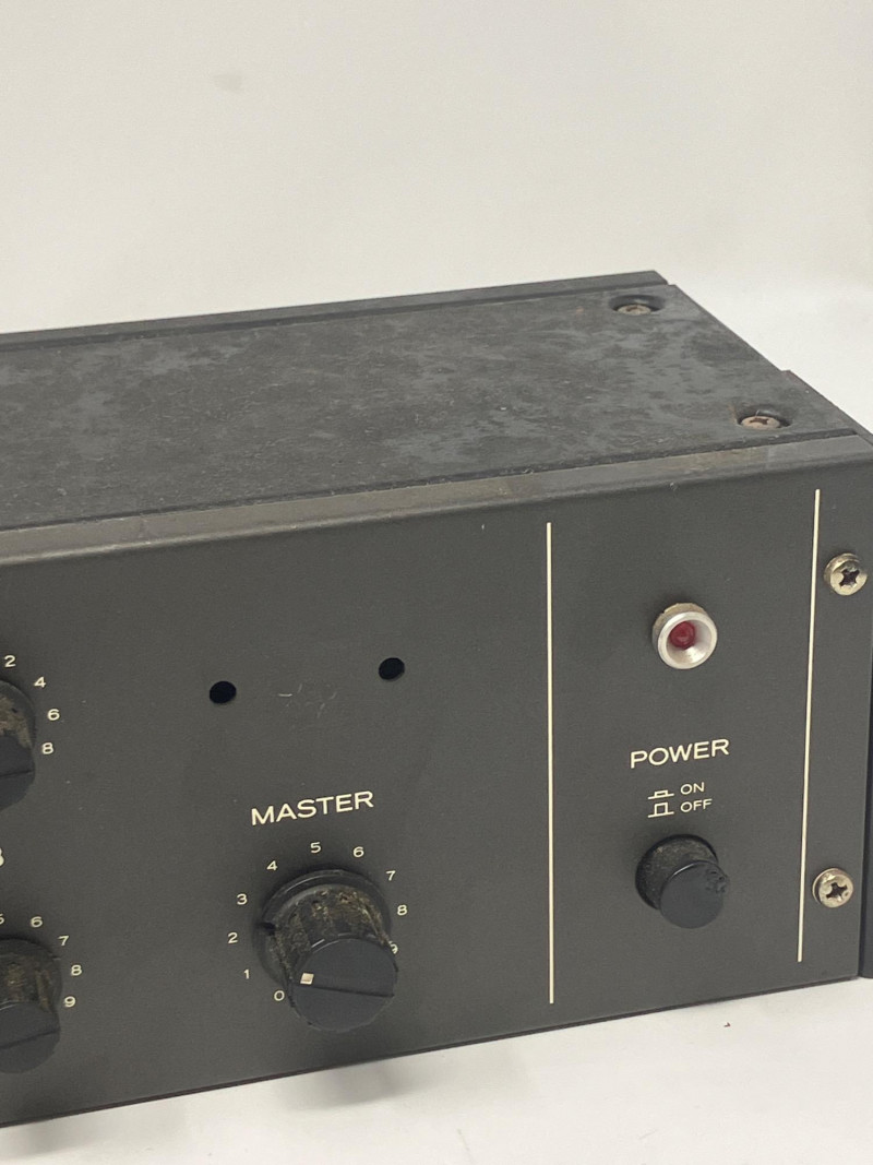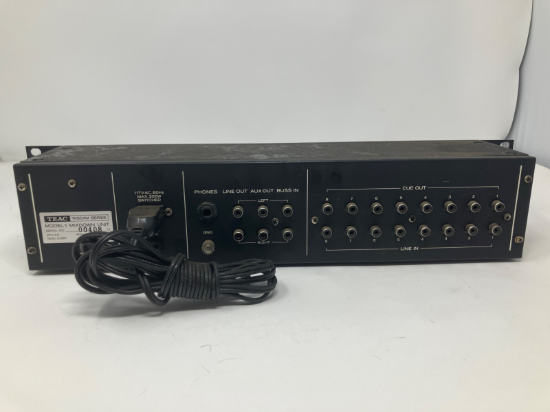 Built around 1979-1980. TEAC model-1 is great for mixing down 8 inputs to a stereo bus or using as a summing mixer for summing multiple signals to one output.It also does nicely as a headphone cue mix as there are 2 outputs for stereo headphones.You can also get two mono mixes with different levels of instruments to satisfy different needs. Works nice to mix 4 stereo signals panned into a stereo mix. If you have several keyboards, synths or drum boxes this mixer will take care of summing it all into a stereo mix. Works well in the studio or on a gig for many purposes. It is simple but useful. And it sounds good. Missing logo plate in solid condition.