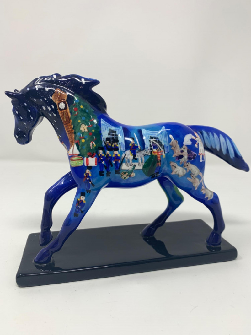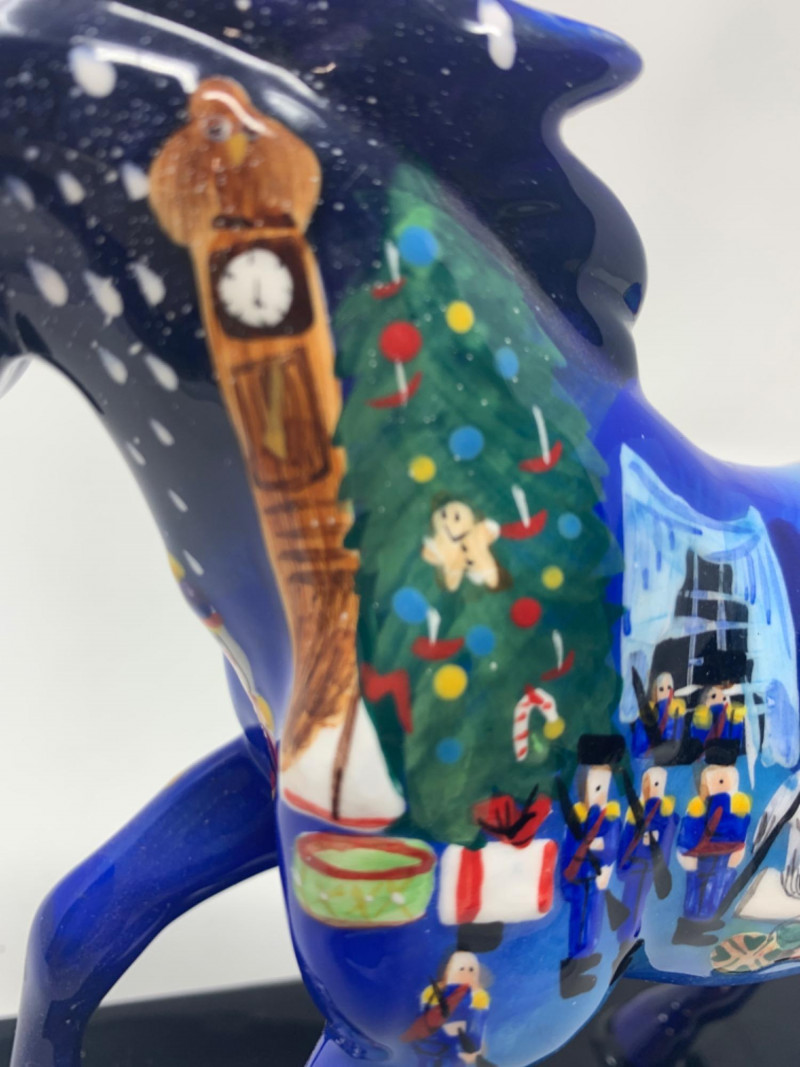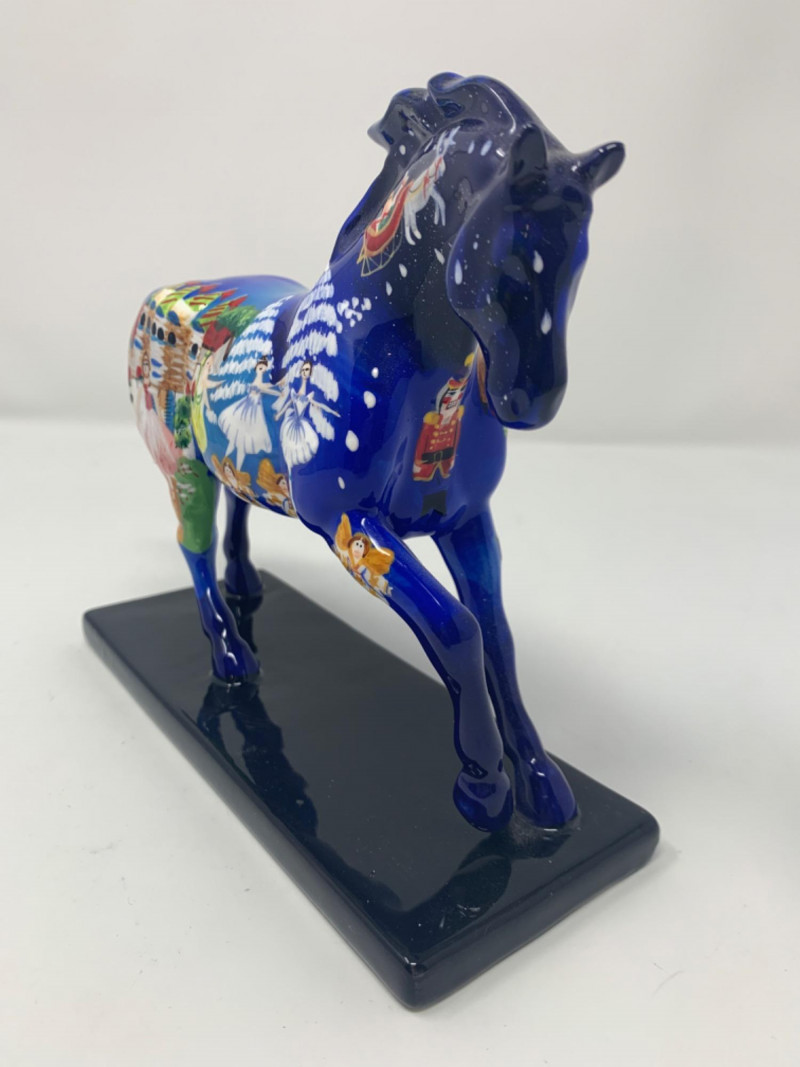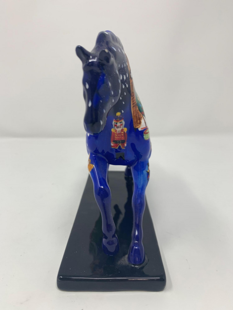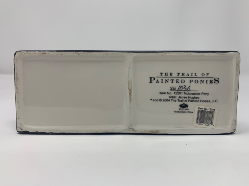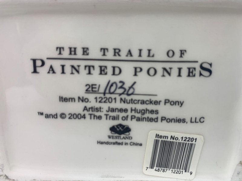 The trail of painted ponies limited edition 2E/1036 item number 12201. Nutcracker Pony by the artist Jamie Hughes. This is a 2004, the trail of painted ponies LLC by Westland. No chips in perfect condition top to bottom all hand painted beautiful. Visually see Clara the main character, the Christmas tree, nutcracker, Grandfather clock and more painted on the pony.