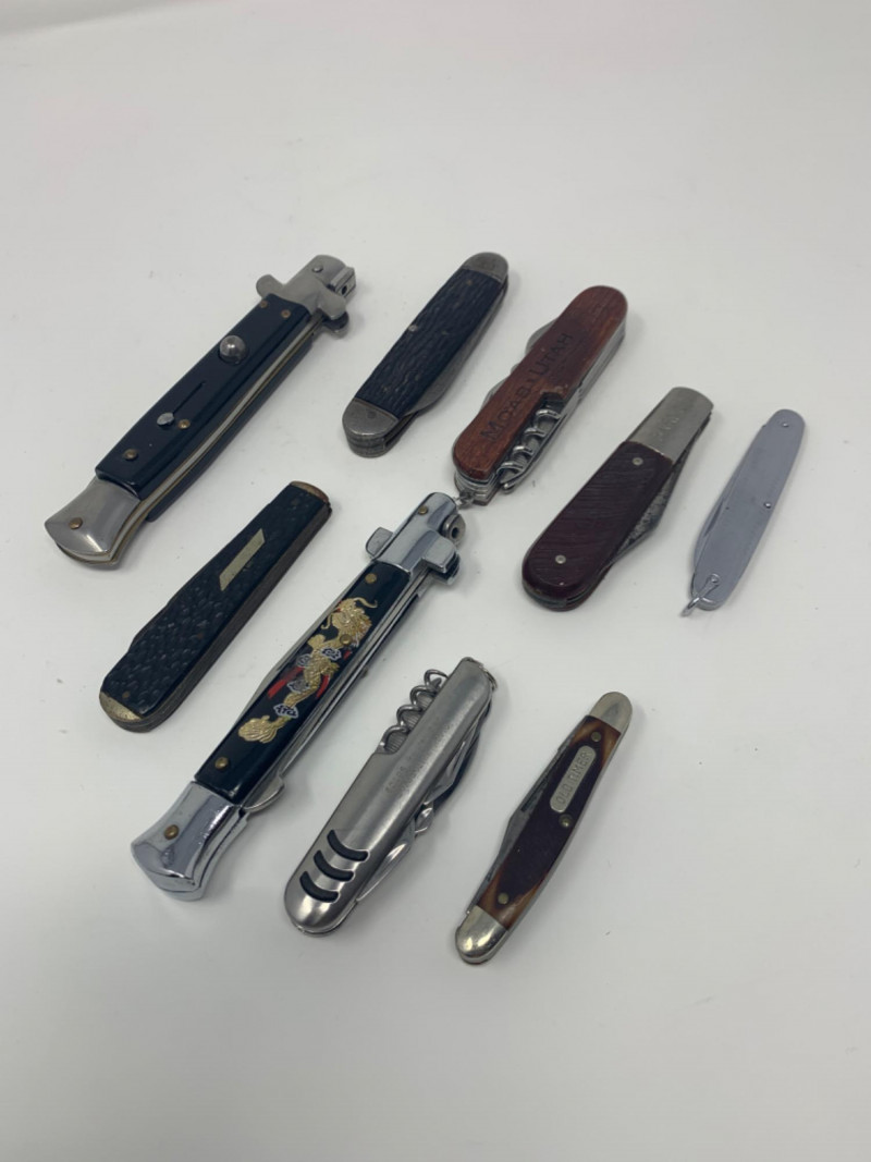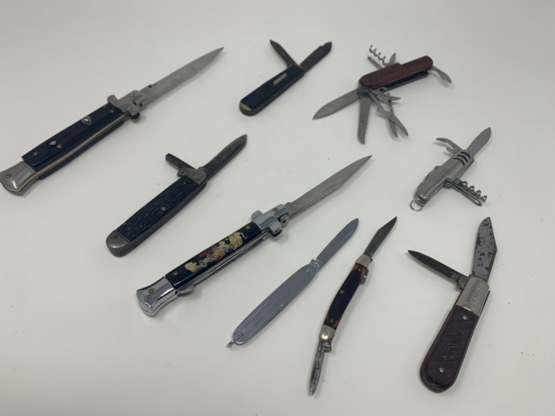 Lot includes Boker USA made pocket knife, Italian Milano made in China stiletto Strada Walden old timer pocket knife imperial made Barlow various Chinese made pocket knives, rep, tech ink made folding knife, etc.