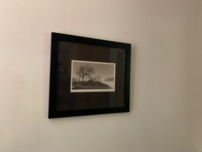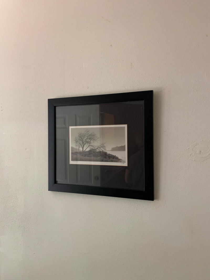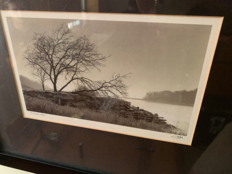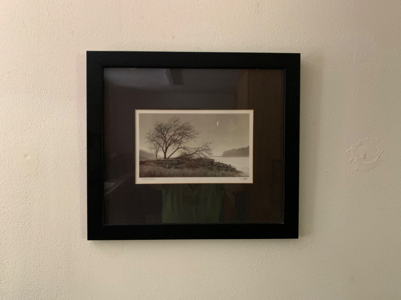 A framed photograph, likely a print, depicting a lone tree in a misty or foggy landscape. The photograph is framed, appearing to be a professionally matted and framed print. It features a black and white or sepia-toned image of a tree, possibly in a winter setting with mist or frost. Similar works have been identified as photographs by name. Could not identify who artist is. The image suggests a focus on the aesthetic beauty of nature, often seen in fine art photography.