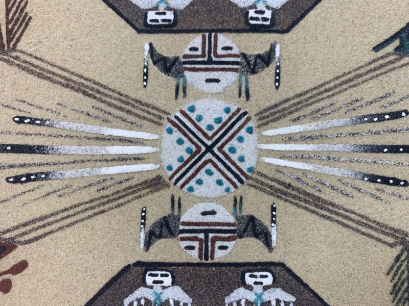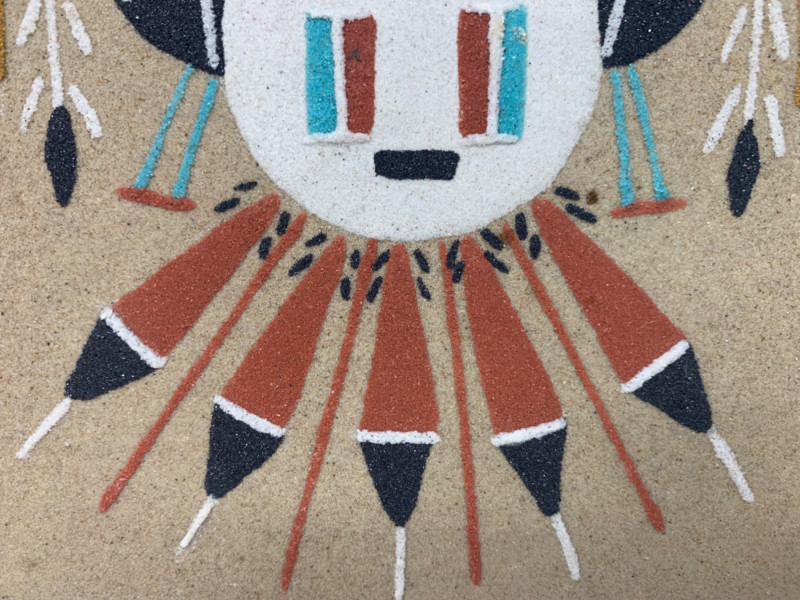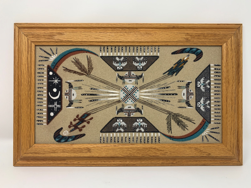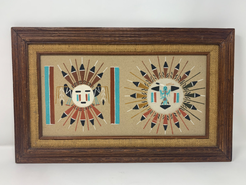 1. Navajo sand painting with a burlap matting. Art Medium:This is a sand painting, a traditional art form of the Navajo (Dine) people, created by carefully applying colored sand and natural pigments to a surface, often a board. Framing:The artwork is housed within a wooden frame, and the painting itself is set against a background that appears to be a burlap mat, providing a rustic texture. Symbolism:Navajo sand paintings are integral to their culture, often depicting symbolic representations from Navajo mythology and used in healing ceremonies to invoke spiritual aid and restore balance. unreadable signature. 2. NATIVE AMERICAN-NAVAJO SAND PAINTING~STORM FIGURE BY JEROME BEGAY Sand painting 'Storm Figure' by Jerome Begay. Undated. Inside measurements 13" H x 7" W. Outside frame measurements 16" x 10". Sand painting uses natural colored sand, white crushed gypsum, yellow ocher, red sandstone, charcoal, charcoal and gypsum (blue) and a mixture of these materials for other colors. Jerome Begay is best known as a silversmith. His jewelry is highly prized and very collectible.