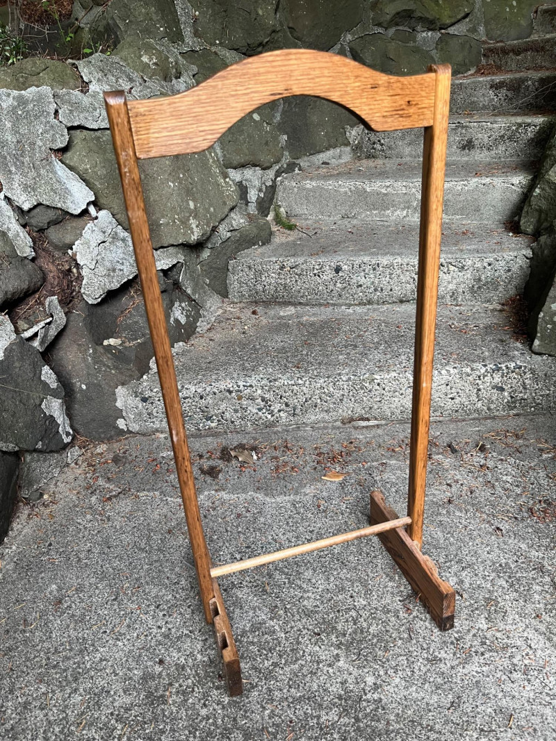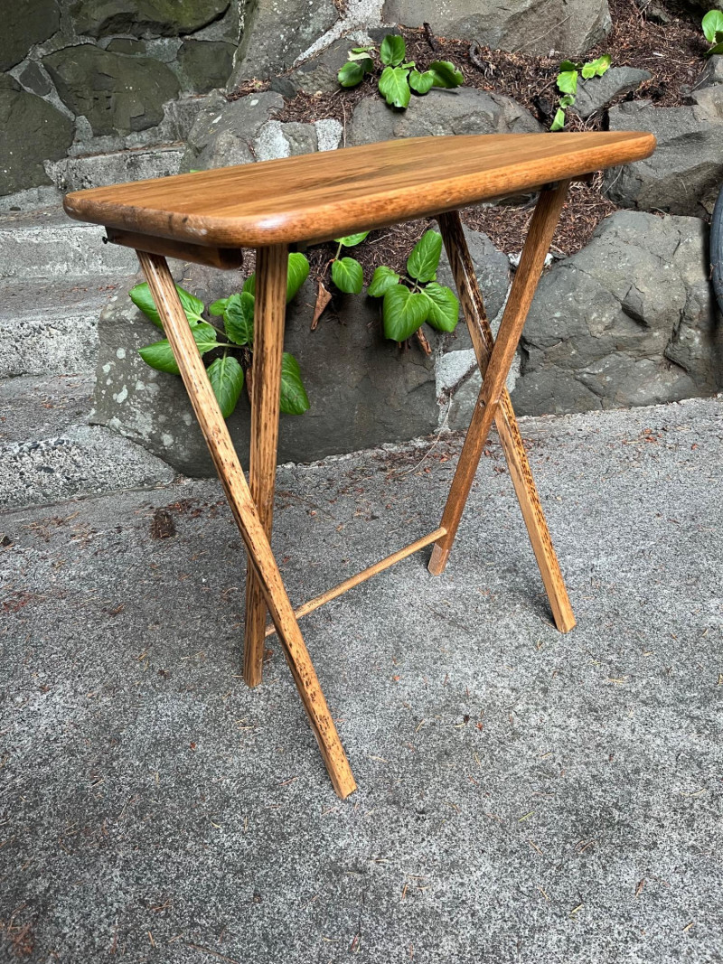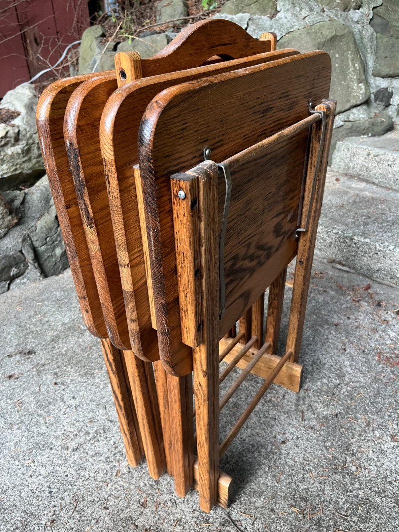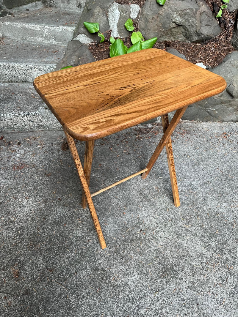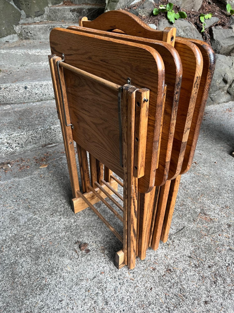 Durable wood folding tables with a handled upright storing rack. Durable wood makes it a great use for crafting or hosting guests. The handle allows for all tables to be transported with little effort.