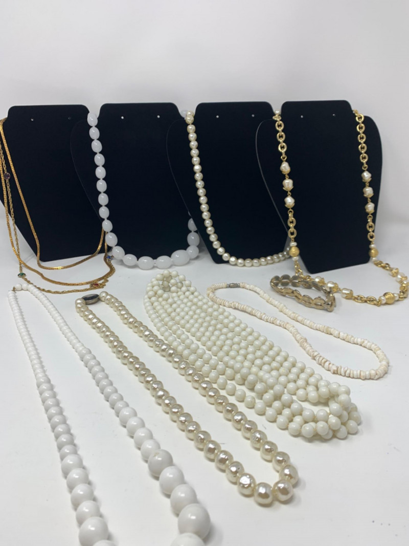 Various sizes of costume, jewelry, gold & whites chains and beads.
