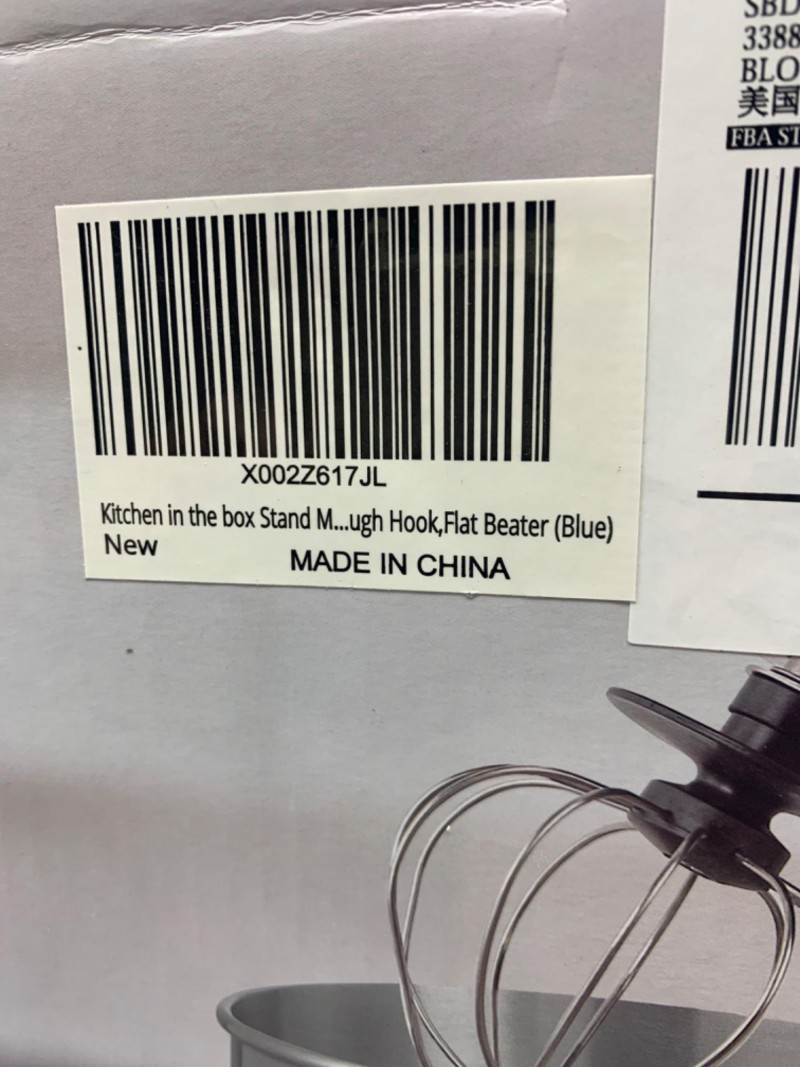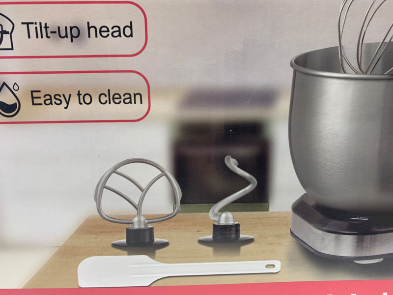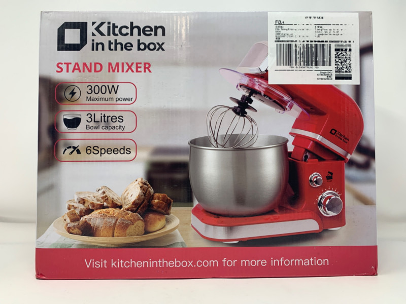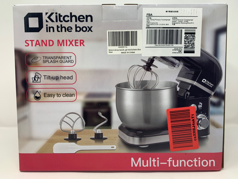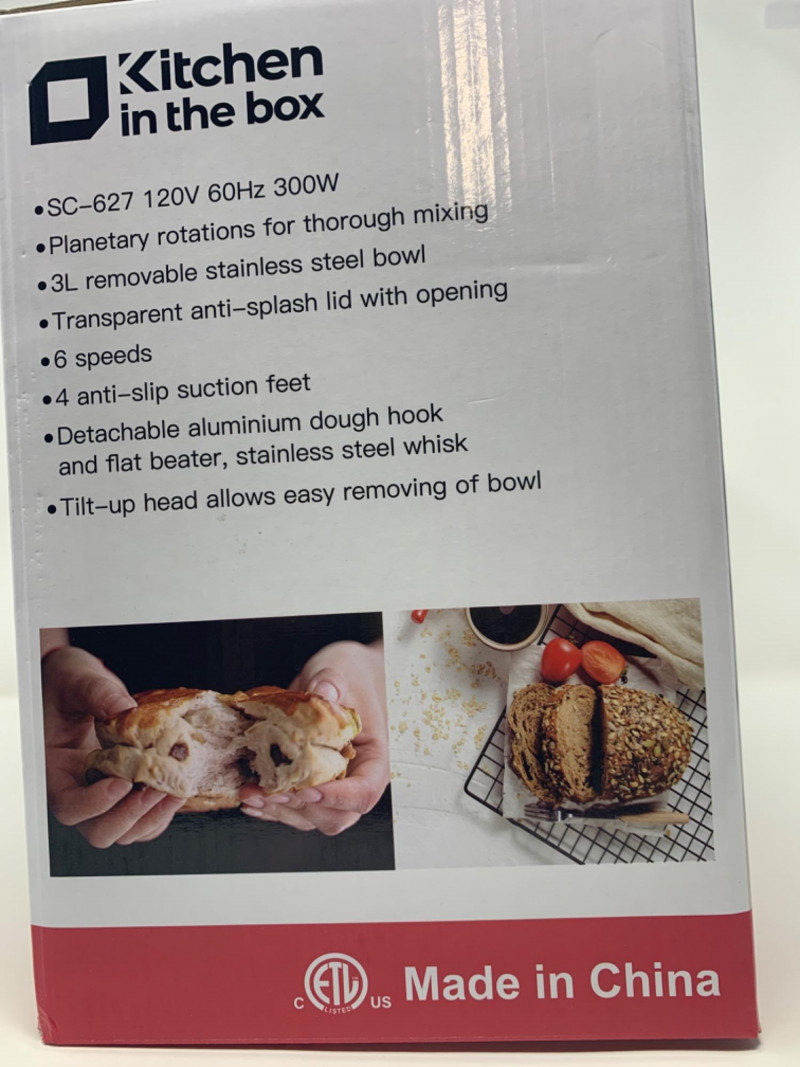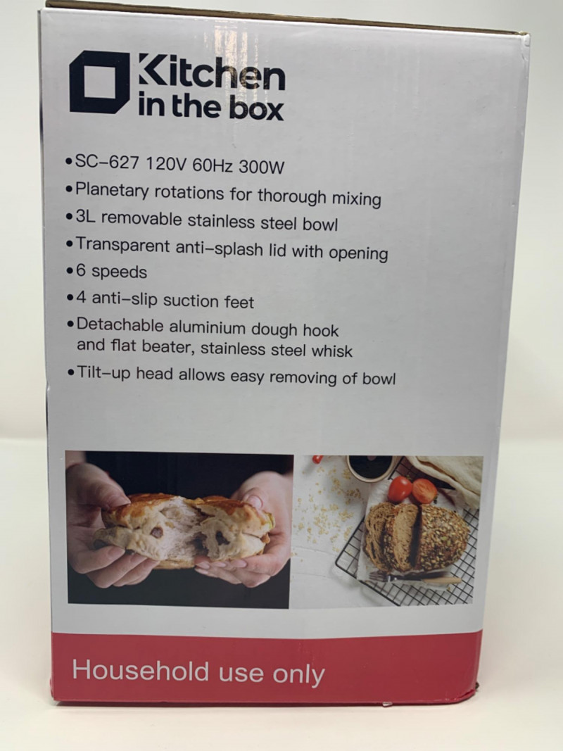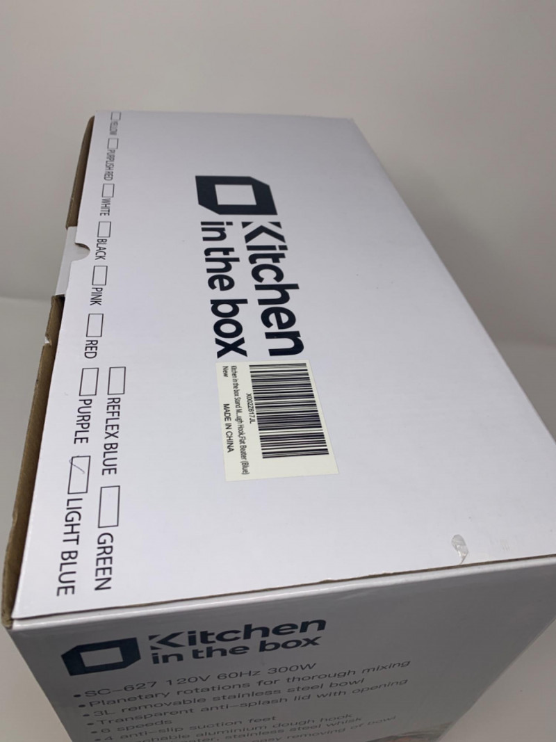Stand mixer from brand Kitchen in a Box- never used in original box/packaging. Color is the Light Blue color- see photos for color confirmation. Includes 3L mixing bowl, transparent anti-splash lid with opening, aluminum dough hook, stainless steel whisk, and a flat beater.