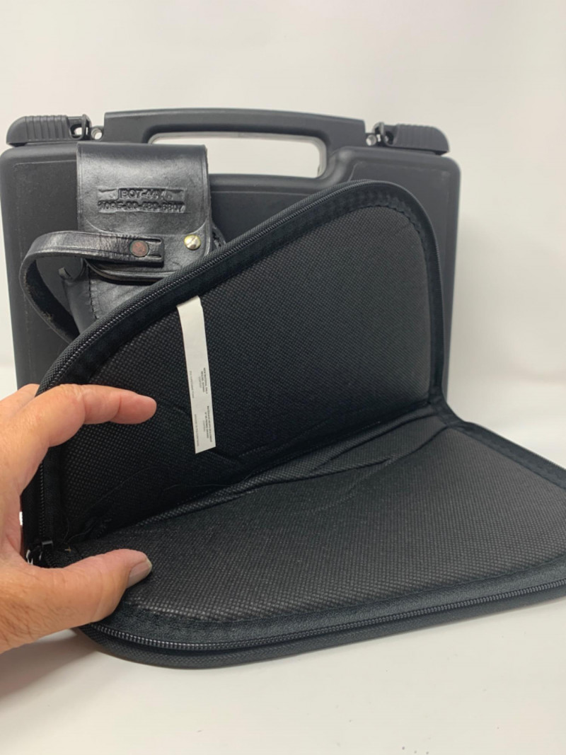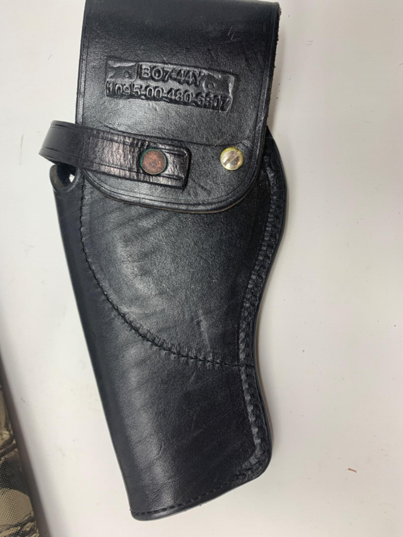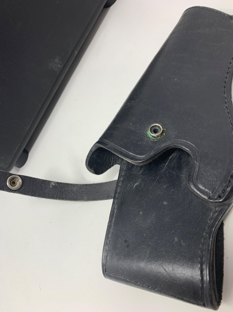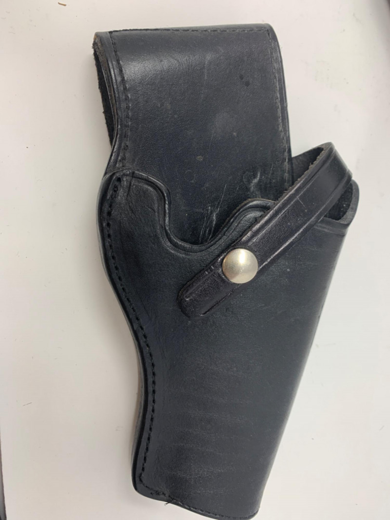Leather Holster. A black leather holster, for a handgun, with a strap and snap closure for retention. The brand "BOYT" and "AMERICAN MADE" are visible on the holster. 9 1/2 inches.