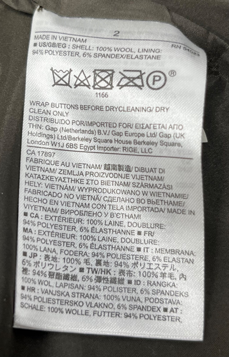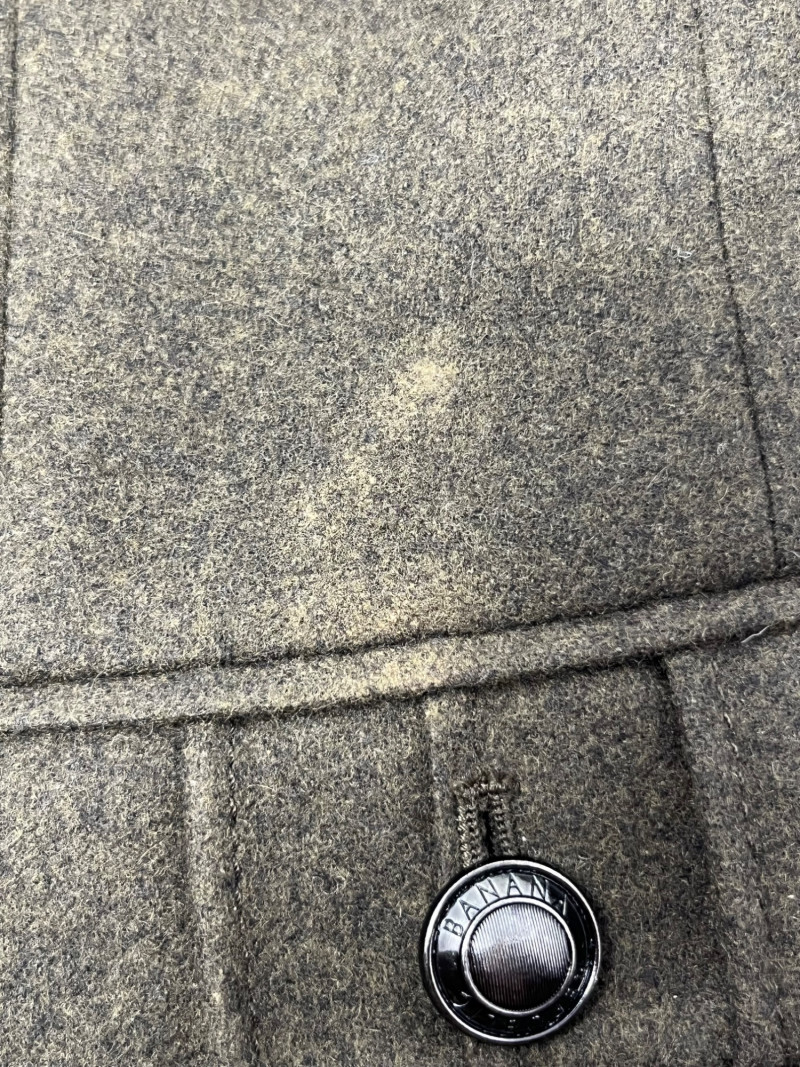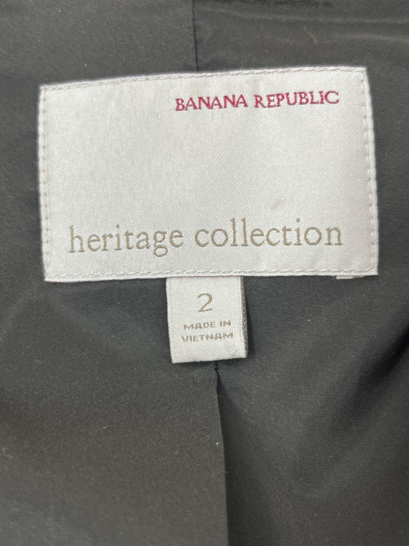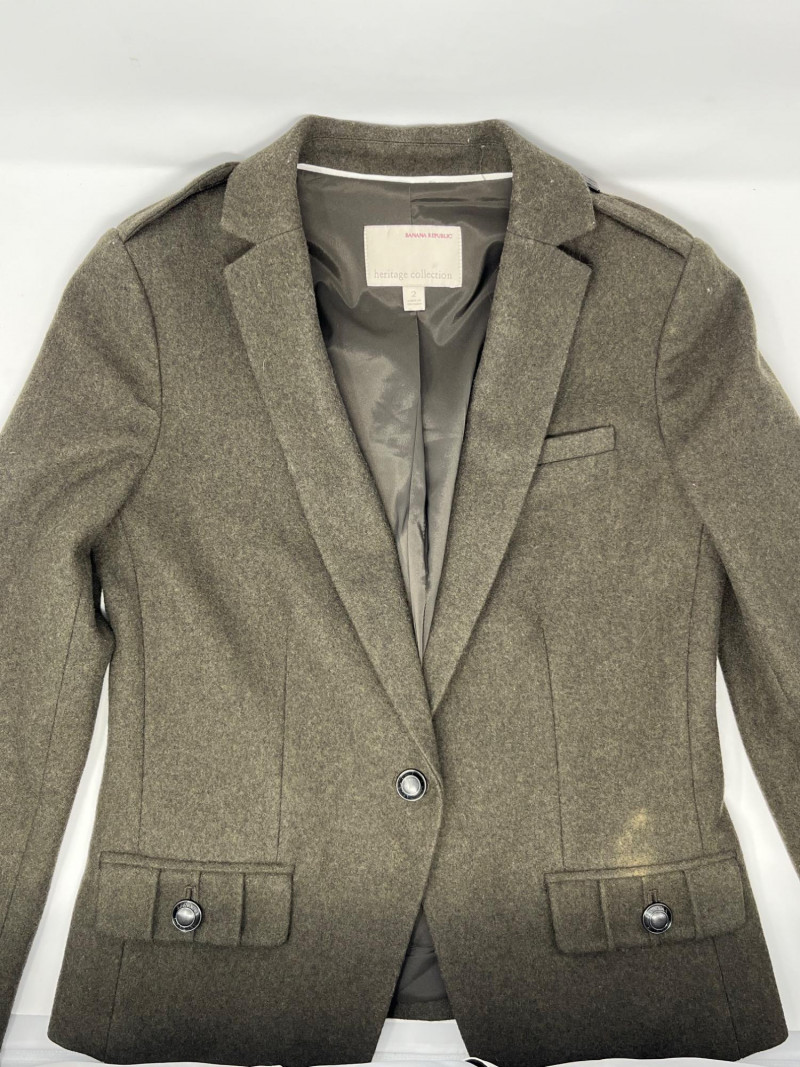 Banana Republic womens wool jacket. Small stain on left pocket- see photo for details. Size 2 from the Heritage collection from BR, it is a 100% wool jacket with a polyester lining. Beutiful green color for the fall season.