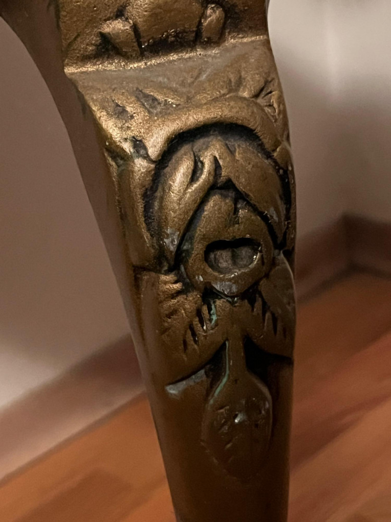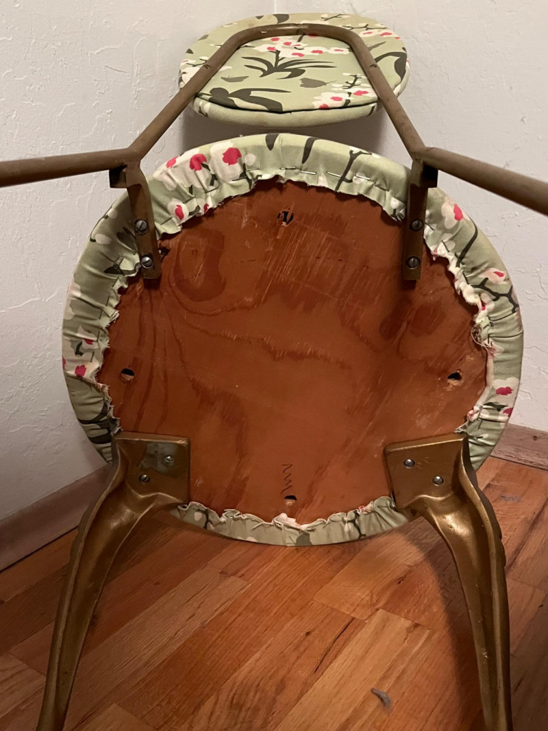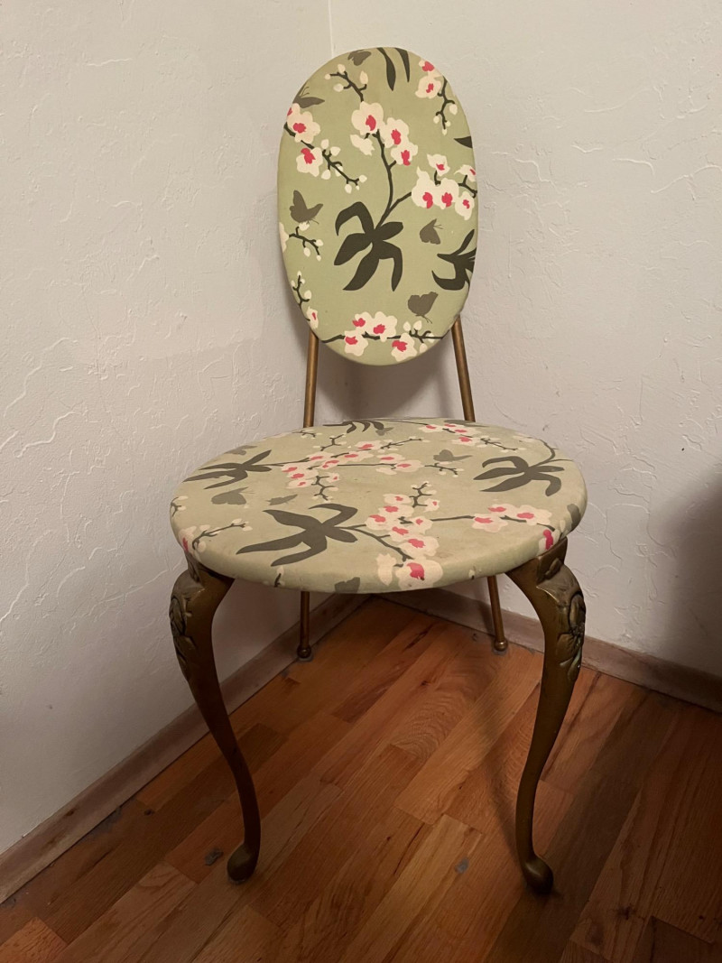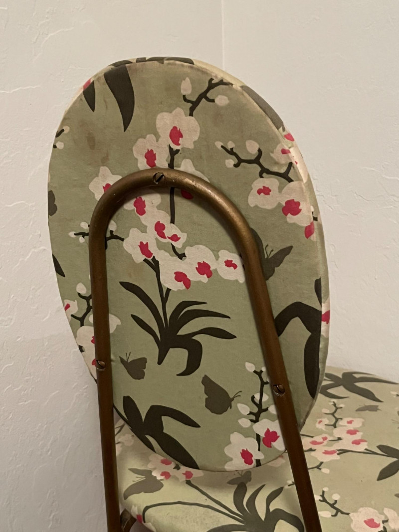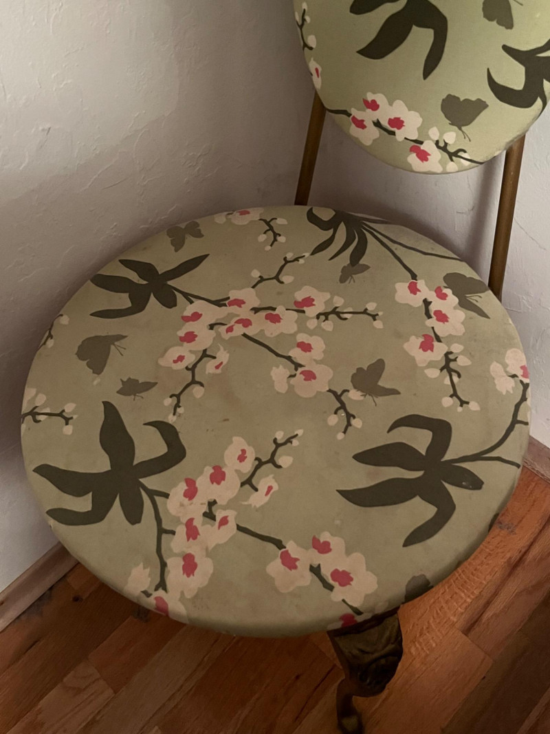 Vintage vanity chair with orchid print fabric on the back and seat. Light staining and discoloration on the fabric. Legs are metal with a wood seating base. Lightly padded on the back and seat. Great for a woman's dressing table or a girls bedroom.