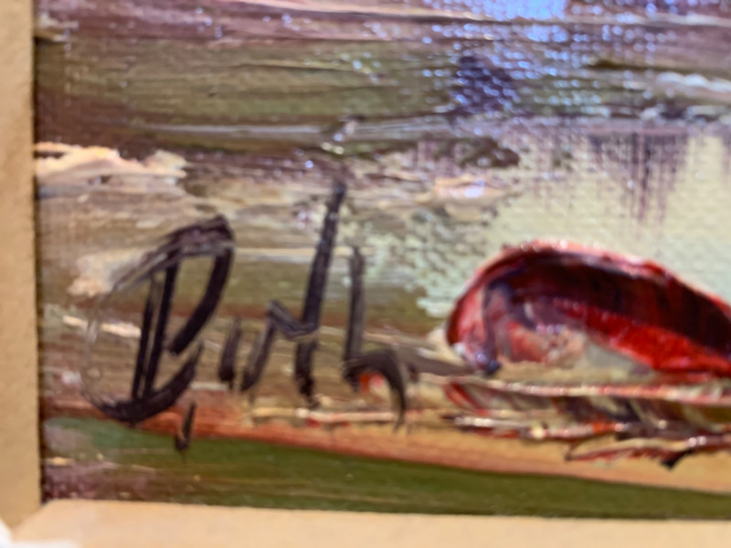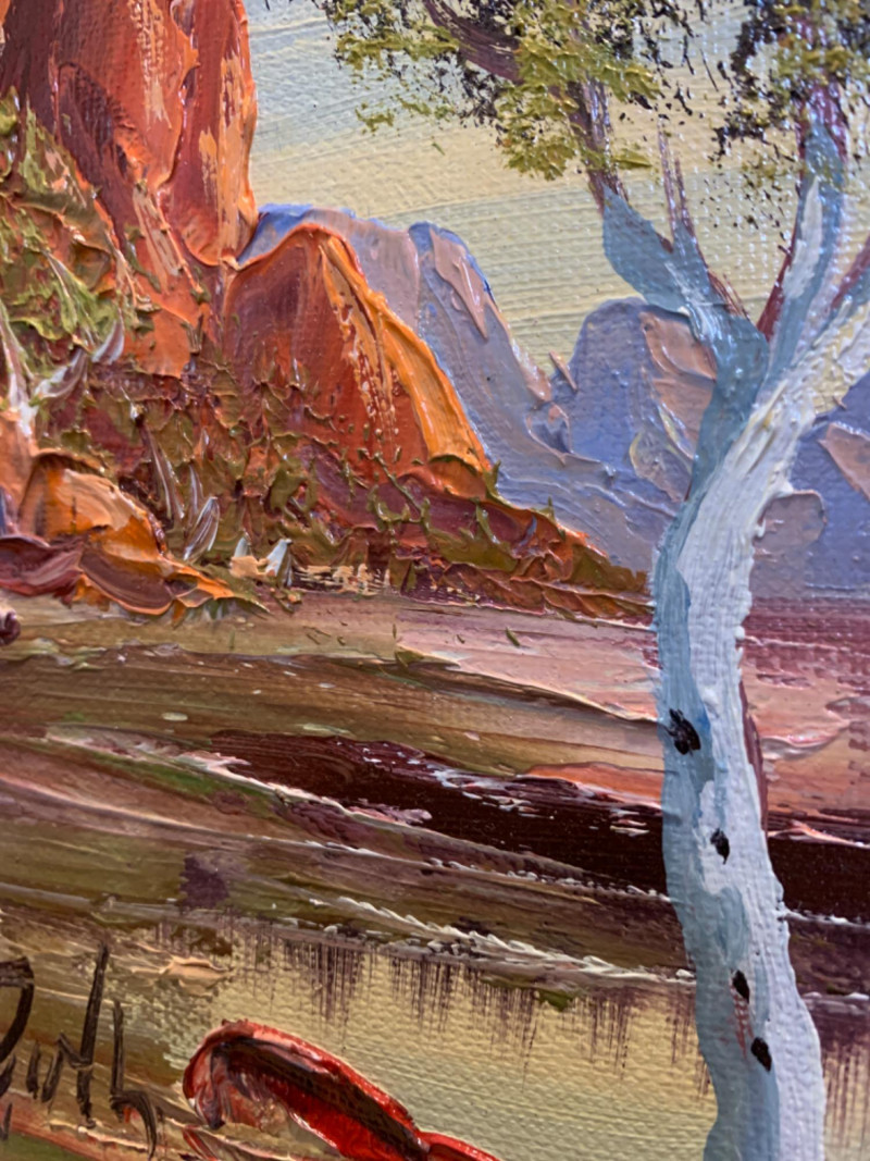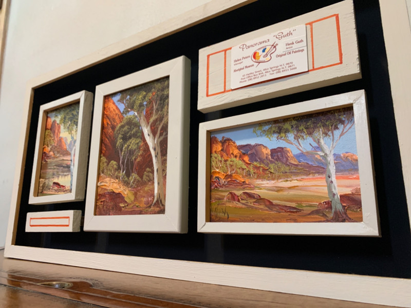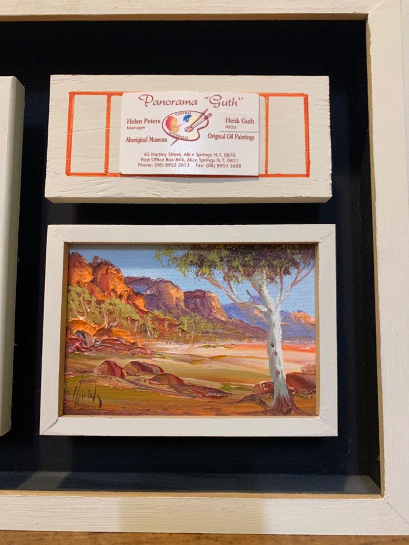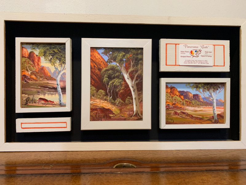 A Shadow box displaying original oil painting of several framed oil paintings by the Australian artist Henk Guth- Signed. Known for his depictions of the Central Australian outback. The label visible on one of the frames mentions "Panorama Guth," which refers to a renowned 360-degree panorama of the Central Australian landscape painted by Henk Guth, located above his gallery in Alice Springs. The paintings feature landscapes with red rock formations, ghost gum trees, and water, characteristic elements of Central Australia. Henk Guth (1921-2003) was a Dutch-born artist who settled in Alice Springs, Australia, and became celebrated for his vibrant and realistic oil paintings of the Australian bushland. His works often depict specific locations like Ormiston Gorge or Ellery Gorge, capturing the natural beauty and distinctive colors of the region. Hank Guth passed away in 2003. One wire screw is loose on the back before hanging.