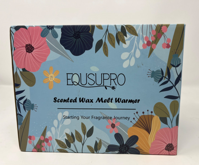 Equspuro scent wax melter in original box, unopened. Button functionality to have set melting time to control how long your wax melts burn. Includes 4 wax melt containers scented with "No Place Like Home".