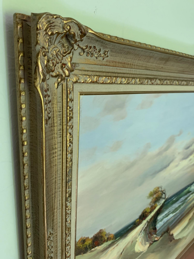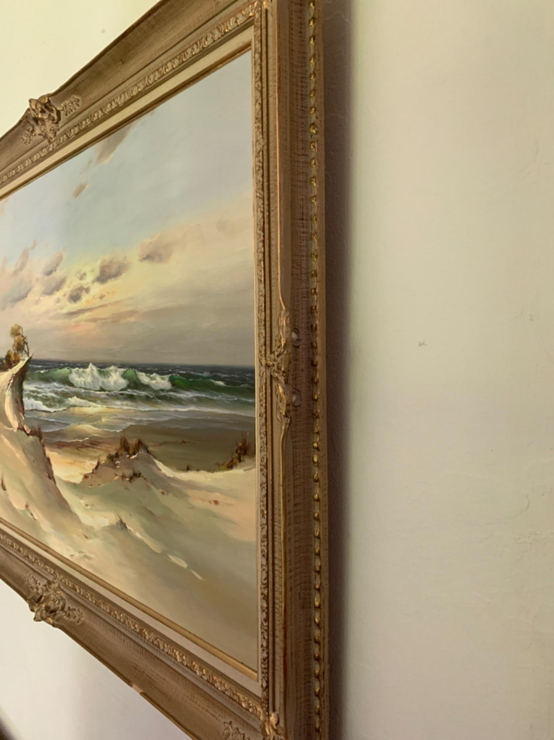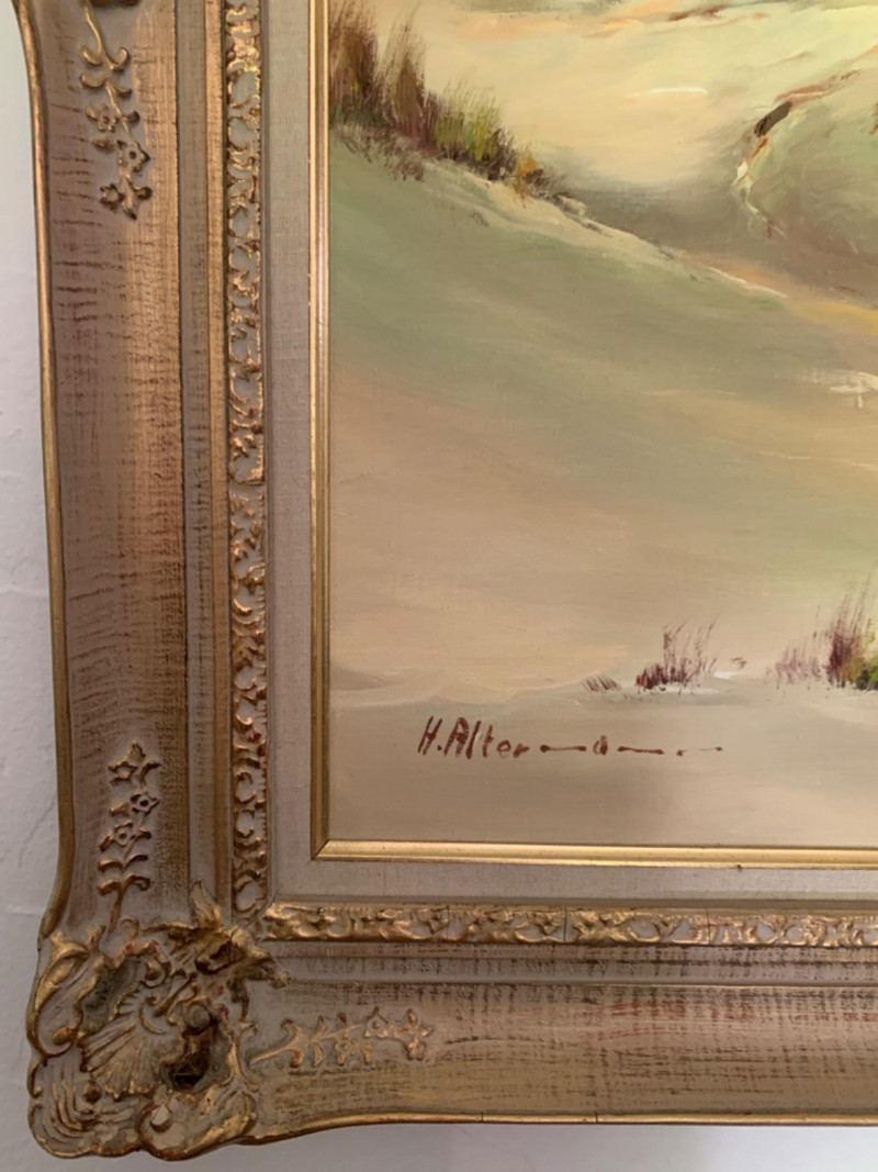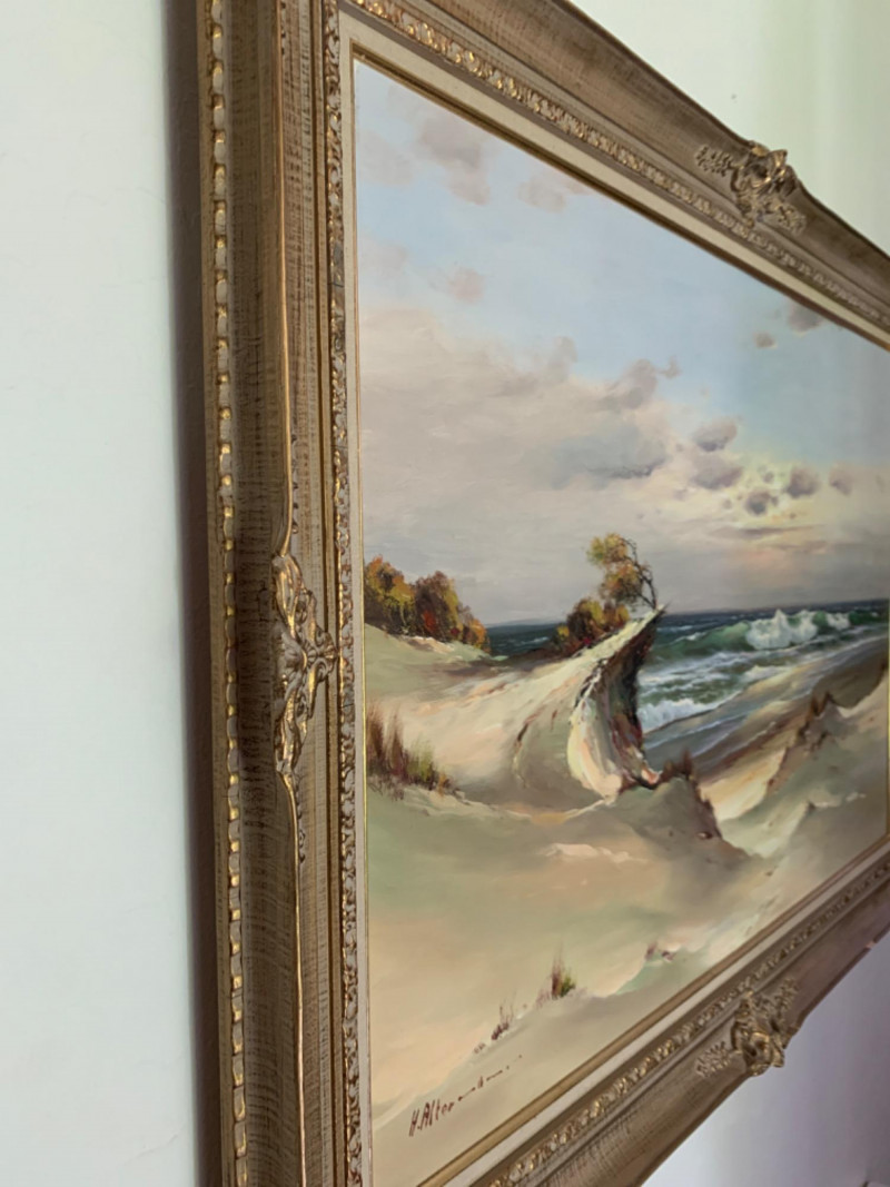 Horst Altermann (1925-1978) - Lg Oil Coastal Seascape Painting Coastal Beach. A framed oil painting depicting a dramatic landscape scene. It features a prominent cliff face with a waterfall cascading into what appears to be a body of water, possibly an ocean with waves visible. The sky above is filled with clouds, suggesting a dynamic weather condition. The painting is housed in an ornate, gilded frame. It’s hard to determine the age of the frame, but it is beautiful. It could be 50s 60s or 70s.. painted on a linen canvas on stretcher bars inserted into a frame 24 x 36. Found an envelope in the back and inside of it is a receipt from the Arlington art Framing store Saskatoon for the Alterman , it was called Sand dunes sold July 27, 1974 cool original original oil paintings original framing receipt. and the name of the man.