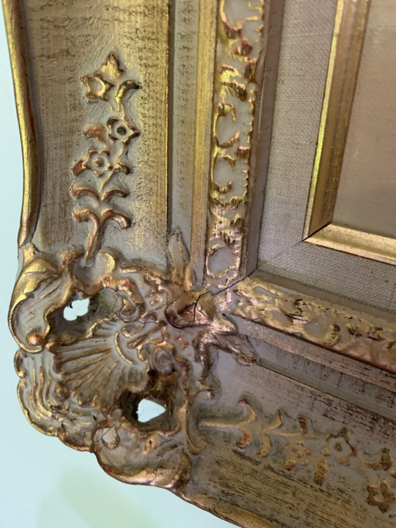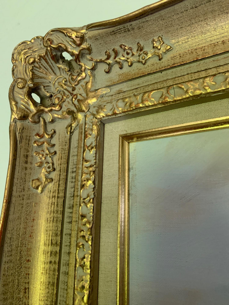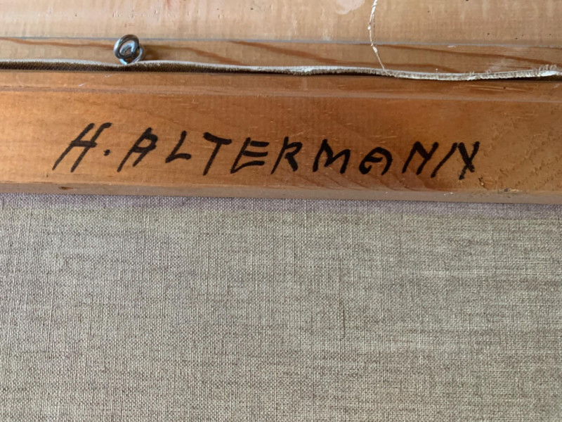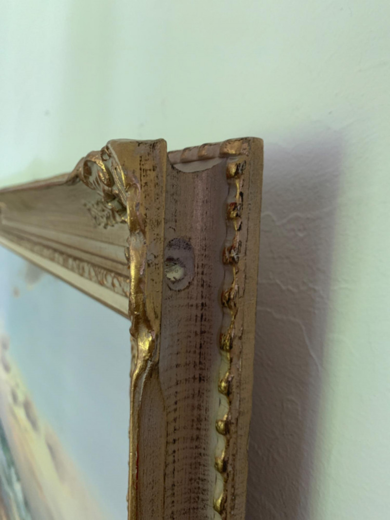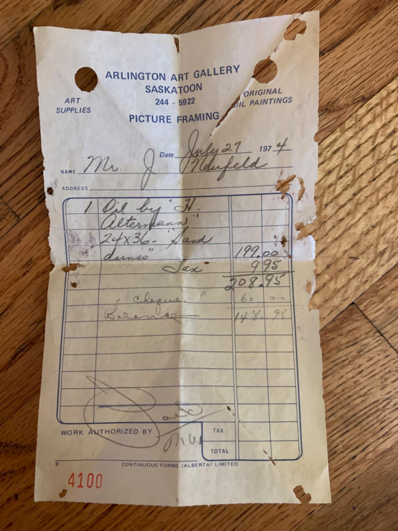 Horst Altermann (1925-1978) - Lg Oil Coastal Seascape Painting Coastal Beach. A framed oil painting depicting a dramatic landscape scene. It features a prominent cliff face with a waterfall cascading into what appears to be a body of water, possibly an ocean with waves visible. The sky above is filled with clouds, suggesting a dynamic weather condition. The painting is housed in an ornate, gilded frame. It’s hard to determine the age of the frame, but it is beautiful. It could be 50s 60s or 70s.. painted on a linen canvas on stretcher bars inserted into a frame 24 x 36. Found an envelope in the back and inside of it is a receipt from the Arlington art Framing store Saskatoon for the Alterman , it was called Sand dunes sold July 27, 1974 cool original original oil paintings original framing receipt. and the name of the man.