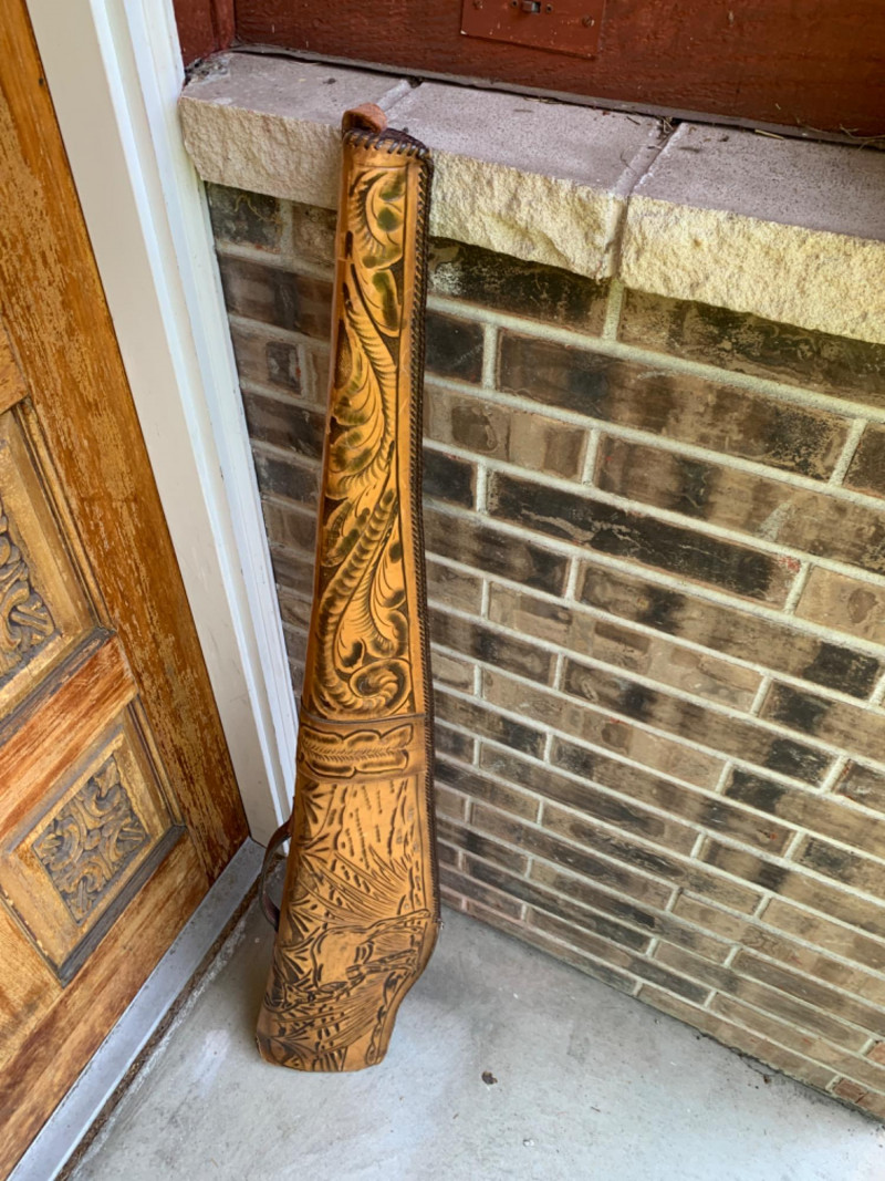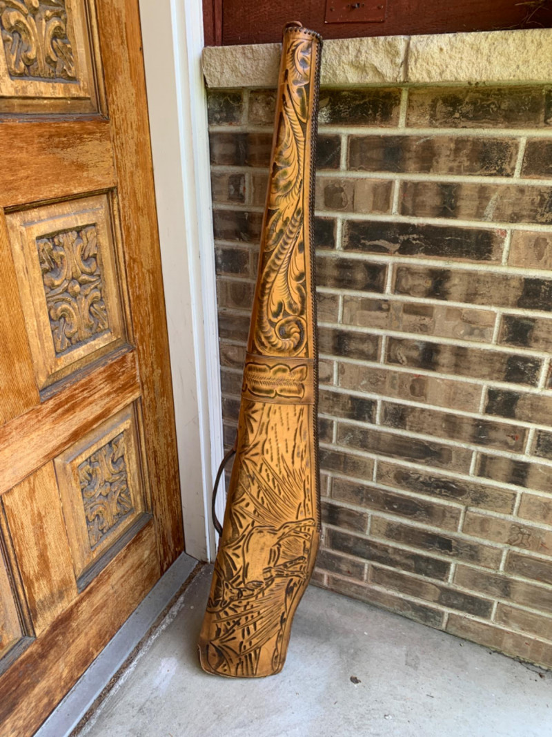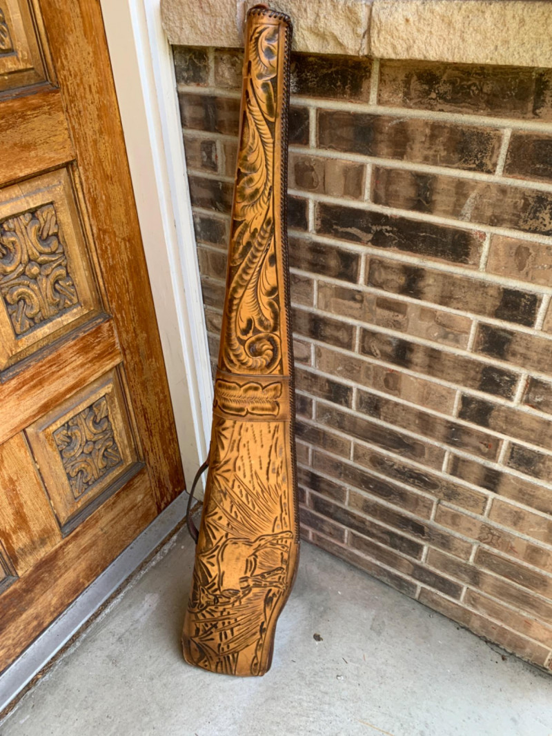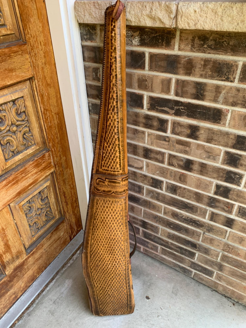 This is a handcrafted leather case designed to carry and protect a long gun, such as a rifle or shotgun. It features intricate tooling on the leather, a top grab handle, and potentially an adjustable shoulder strap for carrying comfort.