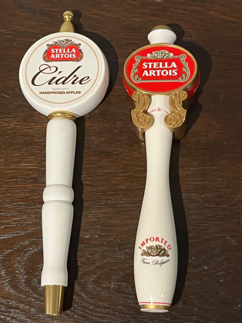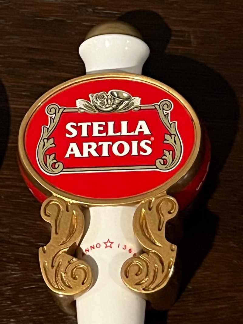 Lot of 2 Stella Artois keg tap handles. Easy screw on application for both handles, and in great condition. Perfect addition to any bar business or decor item for any enthusiasts man cave or home bar.