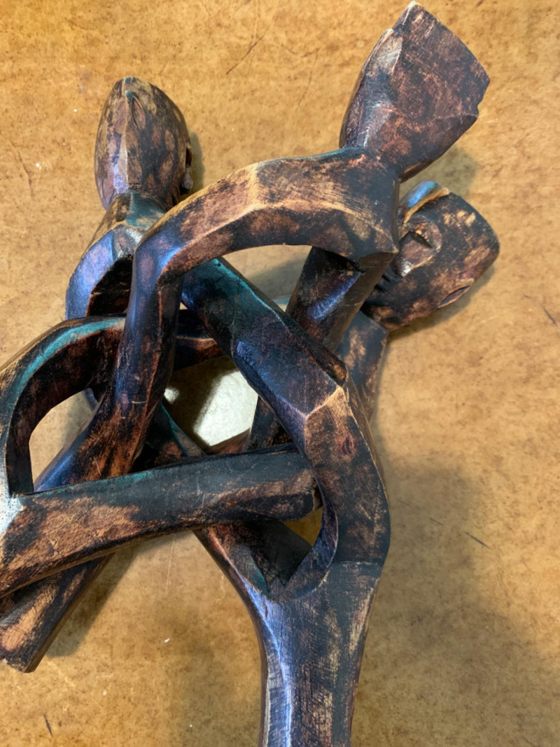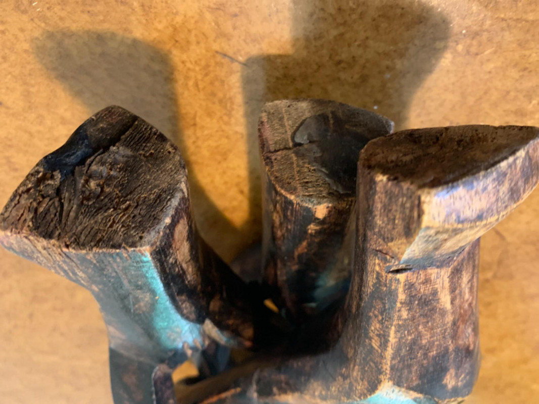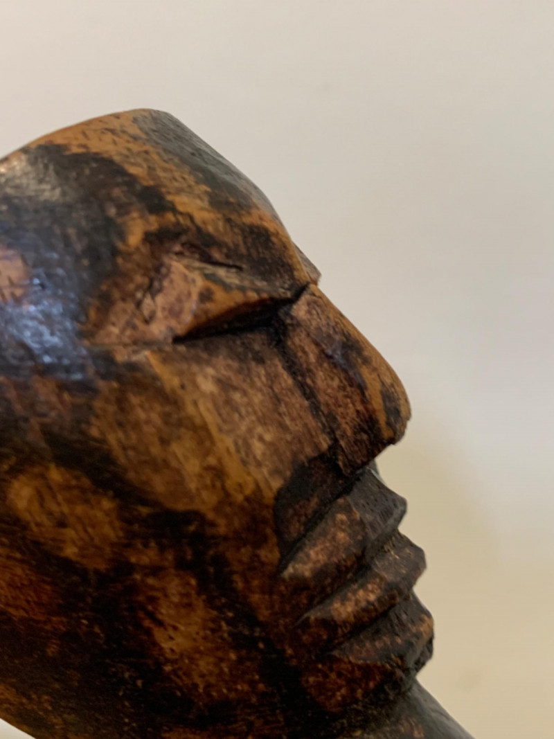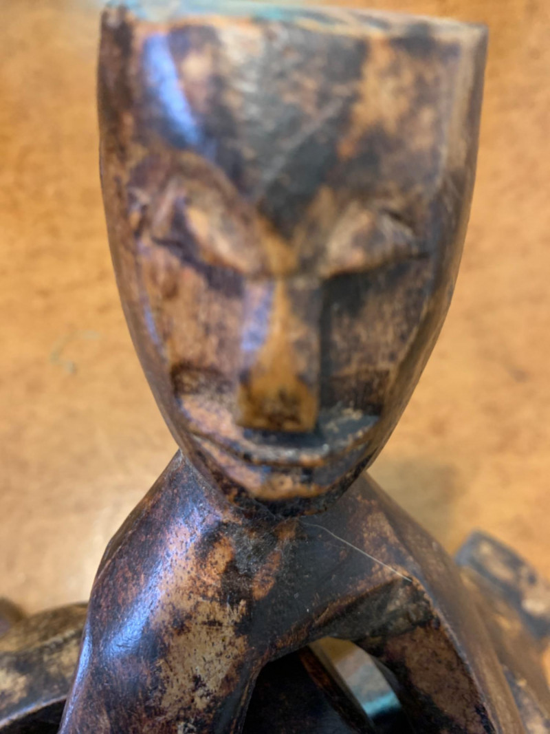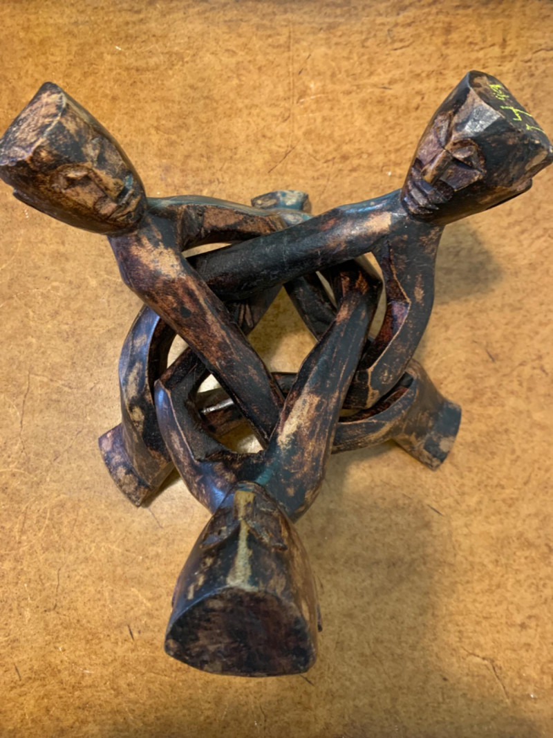 Vintage wooden hand-carved coffee table stand with tribal faces - Large with 3 legs. Made with solid wood by artisans in Ghana. Vintage wooden hand-carved table stand with tribal faces from one piece of wood. Does not include a glass top.
