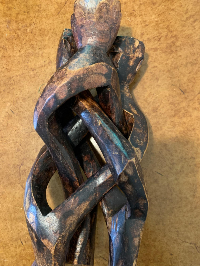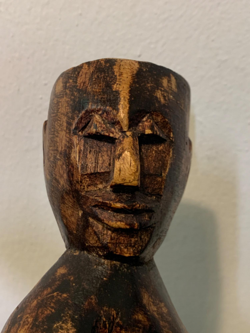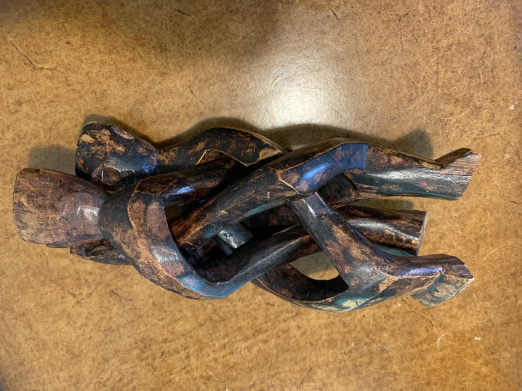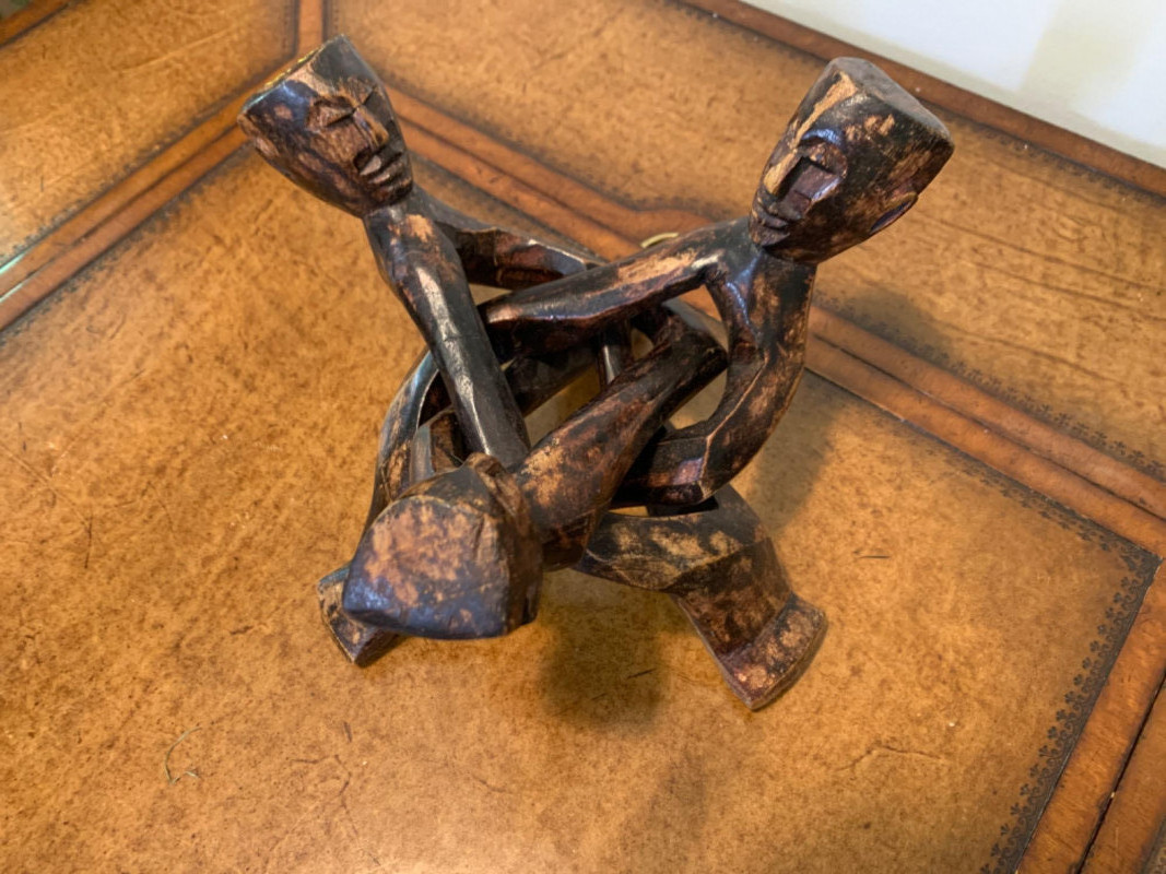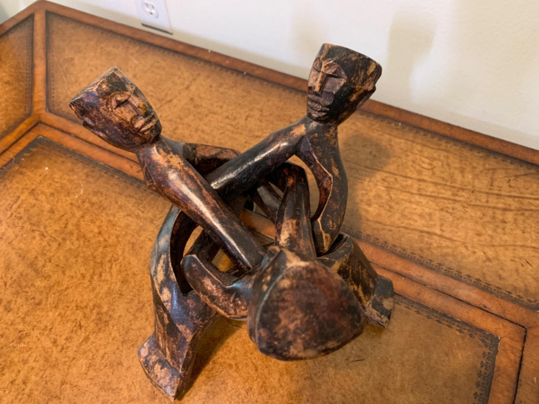 Vintage wooden hand-carved coffee table stand with tribal faces - Large with 3 legs. Made with solid wood by artisans in Ghana. Vintage wooden hand-carved table stand with tribal faces from one piece of wood. Does not include a glass top.