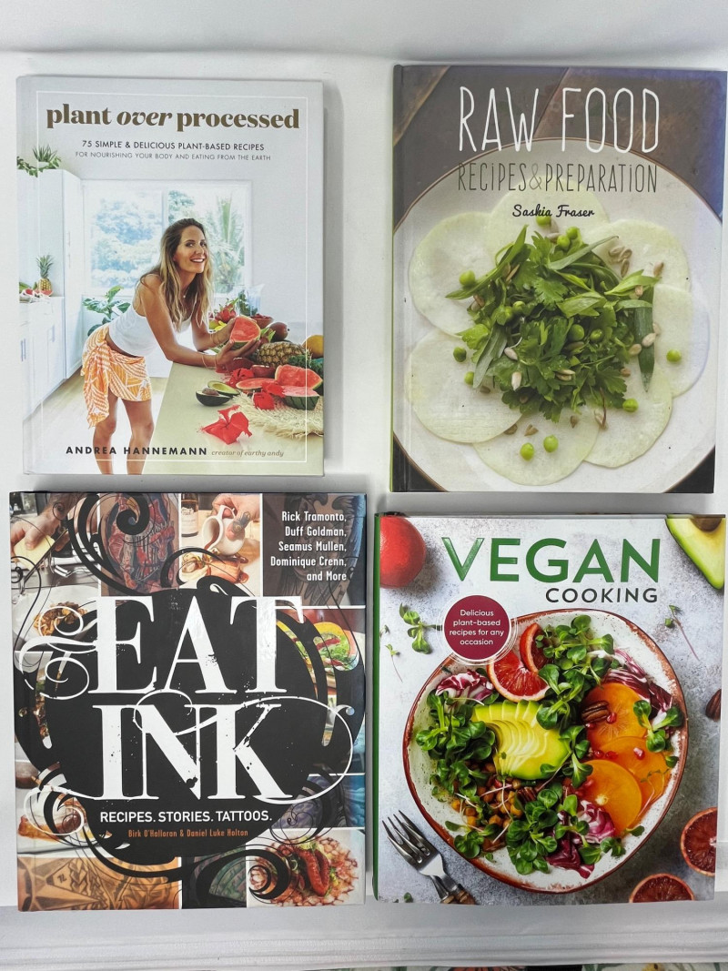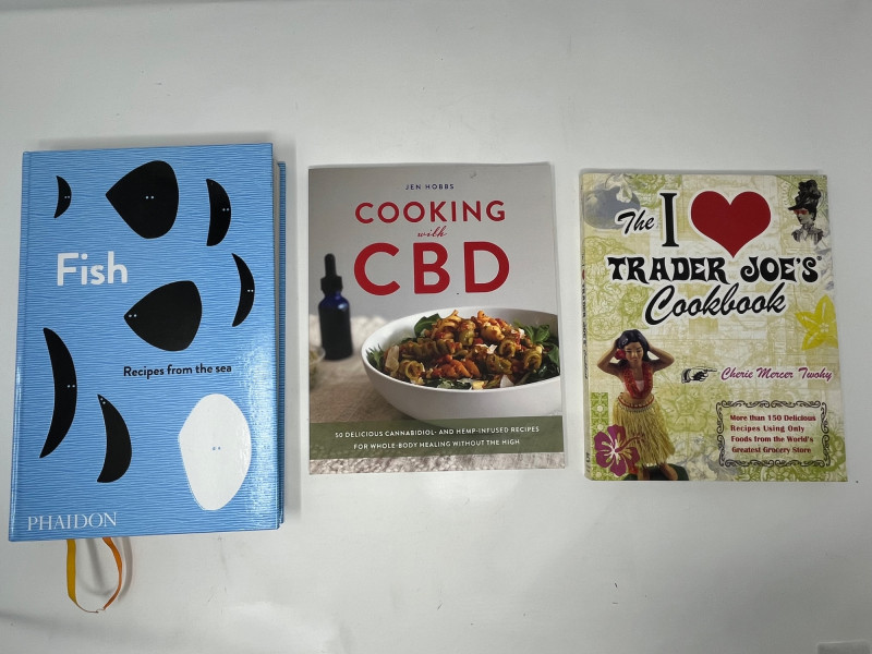 Lot of books centered around cooking. Lot includes the following books: - Fish Recipes From The Sea by CJ Jackson and Barton Seaver (Hardcover) - Cooking with CBD by Jen Hobbs (Softcover) - Vegan Cooking by Publications International (Hardcover) - The I Love Trader Joe’s Cookbook by Cherie Mercer Twohy (Softcover) - Plant Over Processed by Andrea Hannemann (Hardcover) - Raw Food Recipes & Preparation by Sasha Fraser (Hardcover) - Eat sink by Rick Tramonto, Duff Goldman, Seamus Mullen, Dominique Crenn, & more (Hardcover)