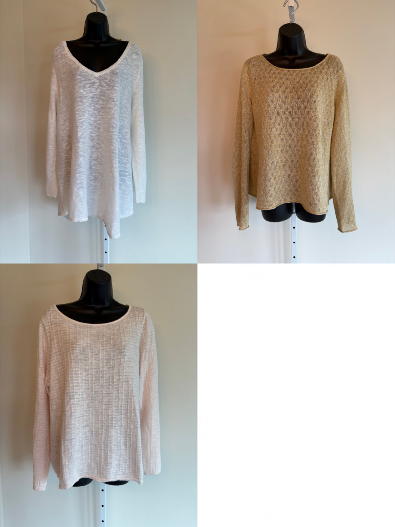 Three lighter weight sweaters in and different weaves and materials. All from Eileen Fisher, measure 23.5" pit to pit, and have XL size tag. White sweater has V-neck, long sleeves, asymmetrical curved hemline, and very sheer weave with horizontal pattern. Linen/cotton blend. Pale green sweater has curved neckline, rolled neck/sleeve ends/hem in open delicate weave with nice hand. 100% linen. Baby pink sweater has curved neckline, long sleeves, and grid-like weave pattern. Linen/cotton blend. Note that we saw a small dab of something on right sleeve during photos - we think it will launder out - see last photo.