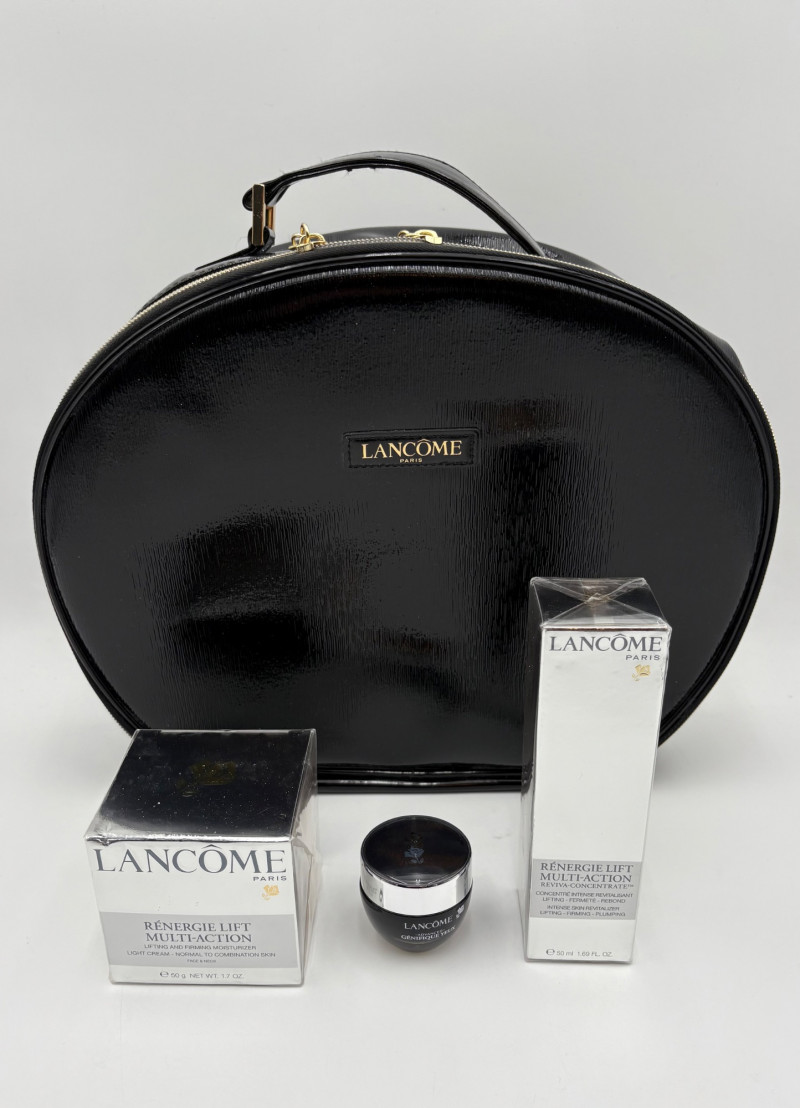 3 Lancome skin care products. All products appear to be new to the best of our determination. - Lancome Renergie Lift Multi-Action Reviva Concentrate - Lancome Renergie Multi-Action Lifting & Firming Moisturizer Cream - Lancome Advanced Genifique Yeux Cream Lancome make-up bag in black (not new)