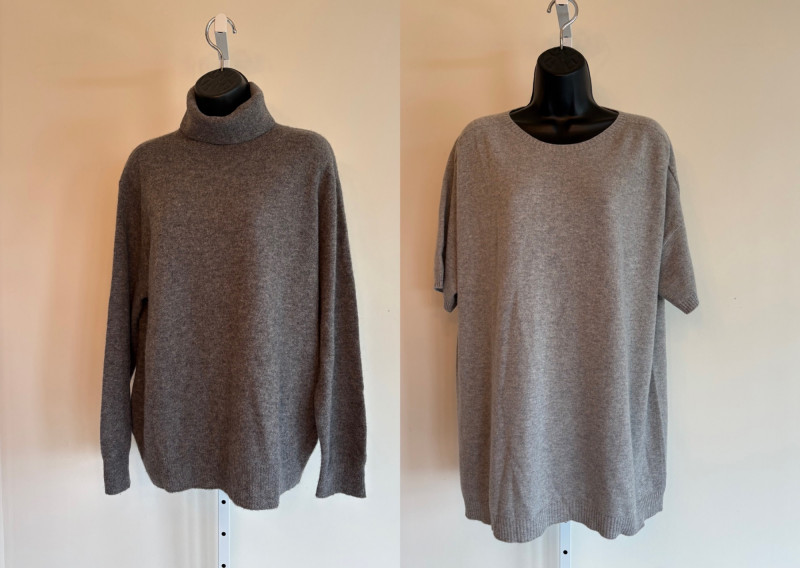 Pair of lightweight 100% cashmere sweaters in two shades of gray from Eileen Fisher and Neiman Marcus. Both measure 24.5" pit to pit. Lighter gray sweater from Eileen Fisher has short sleeves, curved neckline, and straight cut with ribbing around neckline, sleeve, and bottom hem. Size tag says L. Slightly deeper gray sweater from Neiman-Marcus has turtleneck, long sleeves, and ribbing on sleeve, hem, and neckline. Size tag says 2X.