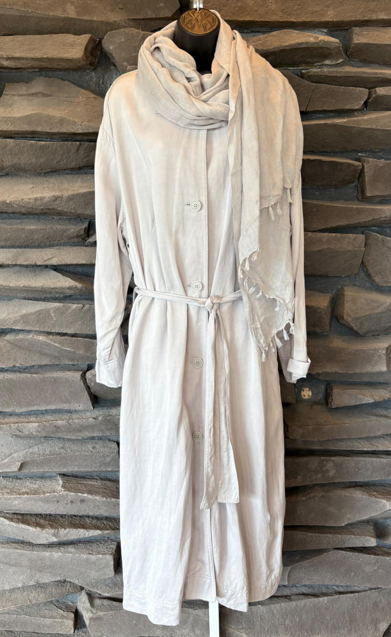Stunning silvery-grey long jacket from Poetry. Jacket has 5 button front closure, long sleeves with adjustable button strap closure, French darts, welted slash pockets in aforementioned darts, 2-piece sleeve construction, split hem, and tie belt (interior of coat is finished with Hong Kong seaming). Viscose/rayon/linen blend gives it a great hand & heft. Measures 27.5" pit to pit and 45" from back neckline to hem. Size tag says 18. Please note - when photographing, we noticed a small light streak across the upper right shoulder - see last photo - but we didn't see it in normal lighting until then. Paired with Eileen Fisher scarf of same silvery grey. Measures approx. 28" x 82". Viscose/cashmere blend.