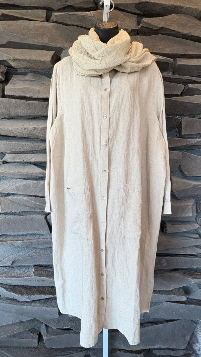 Gorgeous neutral beige linen duster that moves easily from summer to fall. Duster has long sleeves, banded collar, 10 button front closure, front patch pockets, pleated back yoke, 2 button pleated cuffs, and split hem. New with tag. 100% organic linen. Measures 28" pit to pit and 41" from back neckline to hem. Size tag says 2X. Paired with lightweight scarf of same background color with gold embroidered dots and fringe on short ends. Measures approximately 27" x 70". No maker or fabric tag, but feels like a natural fiber blend of cotton and perhaps silk.