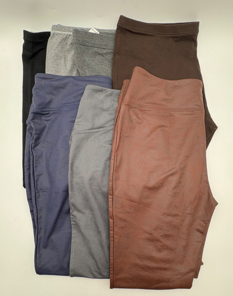Group of leggings for every occasion. All measure 18" from side to side.at waist.. - Black pair from Eileen Fisher is Tencel/spandex blend. Size tag says XL. - Light grey pair from Eileen Fisher is organic cotton/spandex blend. Size tag says 1X. This pair has white overcast stitching along the seams on the exterior. - Dark grey pair from Eileen Fisher is Lyocell/polyurethane blend. Size tag says XL. - Brown pair from Hue is cotton/spandex blend. Size tag says XL. - Leather/wet look navy blue pair from All Worthy is nylon/spandex blend. Size tag says XLT. - Leather/wet look grey pair from DG2 is nylon/spandex blend. Size tag says XL. - Leather/wet look brown pair from All Worthy is nylon/spandex blend. Size tag says XLT.