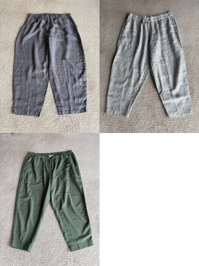 Natural fibers that fall beautifully from Eileen Fisher & Poetry. Poetry blue-grey linen pants have elasticated waistband, set-in front pockets, and generously cut legs. Measure 18" side to side at waist. Size tag says 16. Eileen Fisher green lightweight cotton pants have elasticated waistband, fly front, back welted pocket, and front patch pockets. Measure 18" side to side at waist. Size tag says XL. Poetry grey/white linen twill pants have elasticated waist with drawstring, in-seam side pockets with top-stitching, and generous lantern-cut legs. Measure 18" side to side at waist. Size tag says 16.